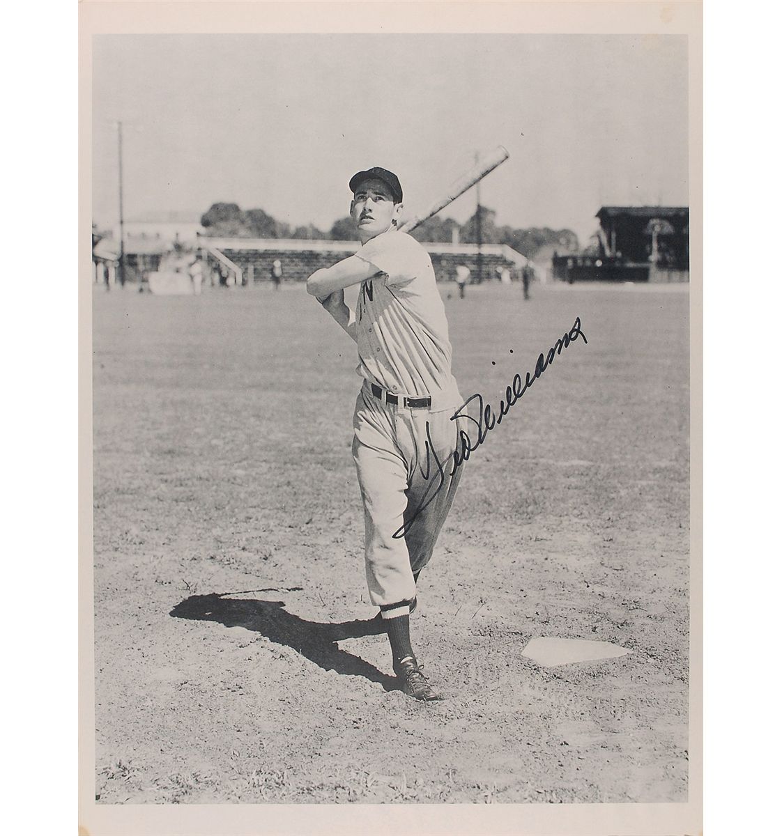 Classic 18 x 24 cardstock photo of Williams swinging, boldly signed in black felt tip. In fine condition, with mild scattered soiling and some light rippling.