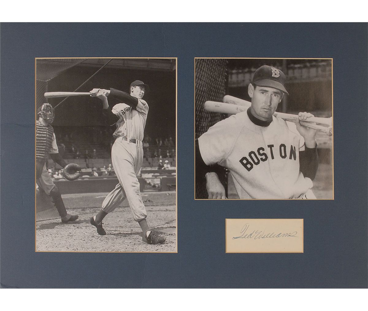 Vintage ballpoint signature, “Ted Williams,” on an off-white card. Matted with two photos of Williams in his Red Sox uniform to an overall size of 19.75 x 14. In fine condition, with a couple creases to one of the unsigned photos.