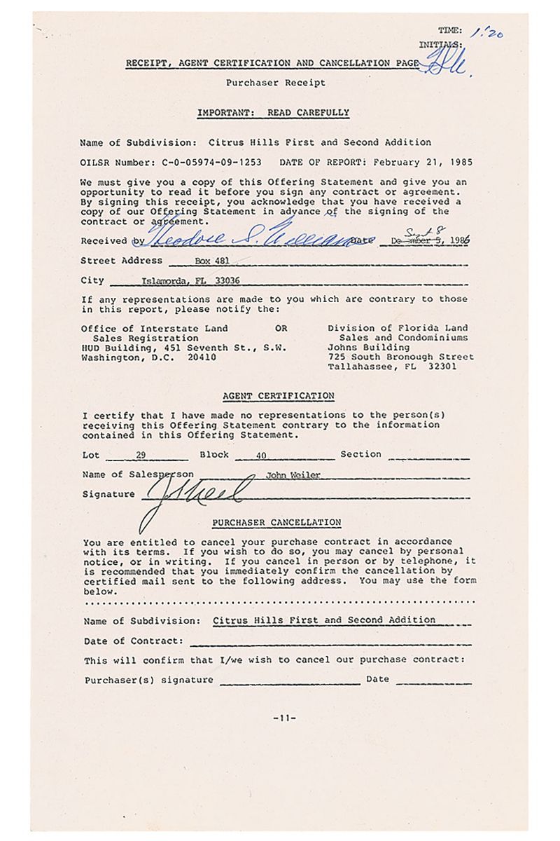 DS, signed “Theodore S. Williams,” one page, 8.5 x 14, September 8, 1986. Real estate purchaser receipt for a Citrus Hill subdivision, with Williams acknowledging he received a copy of the offering statement. Signed near the top in blue ballpoint by Williams and also signed by the real estate agent. Document is also initialed at the top by Williams. In fine condition.