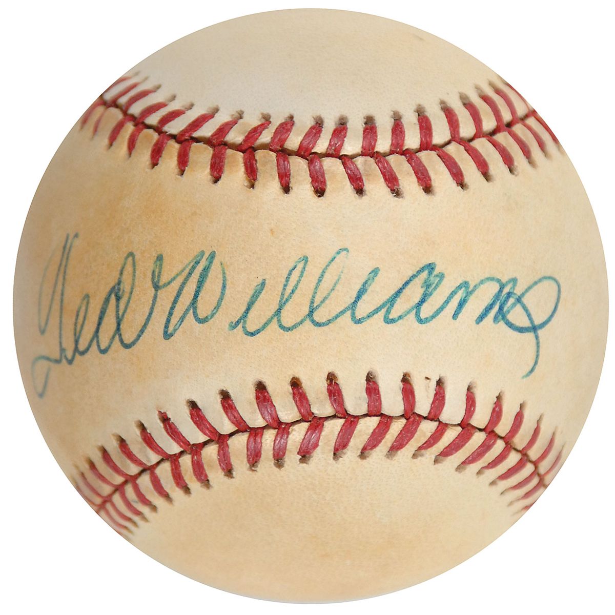 Official Rawlings American League baseball signed in blue ballpoint on the sweet spot. In very good condition, with scattered toning, not affecting the legibility of Williams’s large signature. Accompanied by a full letter of authenticity from PSA/DNA.