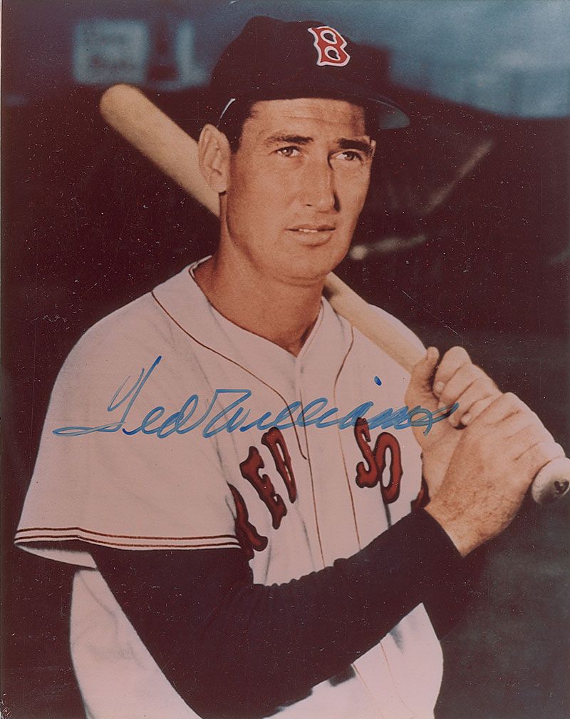 Color glossy 8 x 10 photo of Williams posing with a bat on his shoulder, signed in blue felt tip. In fine condition.