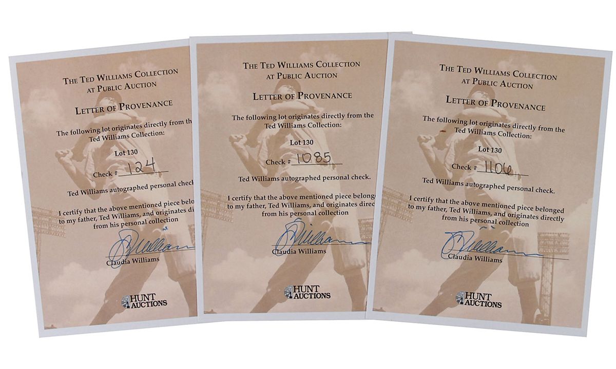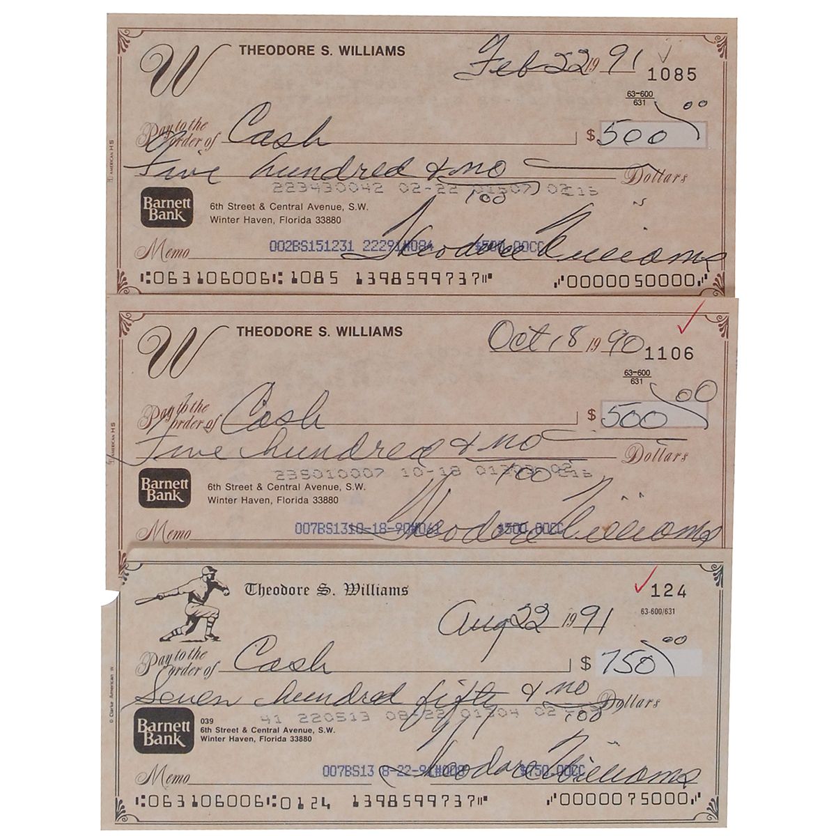 Three personal checks, each 6 x 2.75, filled out and signed by Williams, “Theodore Williams,” payable to Cash, dated 1990 and 1991. Each check is also endorsed by Williams on the reverse, “Theodore Williams.” In overall fine condition, with expected bank stamps affecting signatures on the front but not endorsements to reverse, and a bit of paper loss to the upper left corner of one check. Originally from the Williams family estate, each check is accompanied by a letter of provenance signed by his daughter.