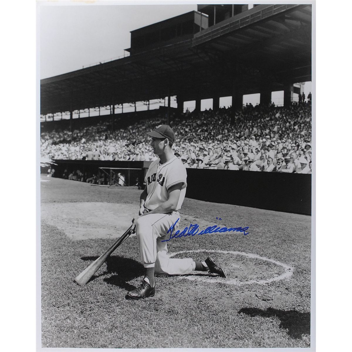 Satin-finish 16 x 20 photo of Williams kneeling in the on-deck circle, prominently signed in blue felt tip. In fine condition, with trivial edge toning (affecting no part of the beautiful, crystal-clear image).