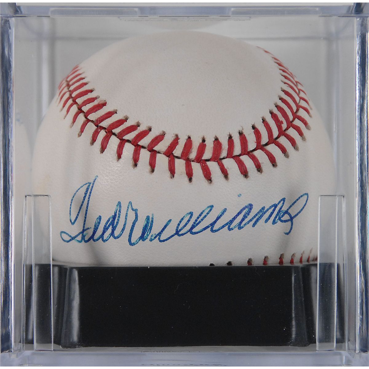 Official Rawlings American League baseball signed in blue ballpoint on the sweet spot. Encapsulated in a plastic PSA/DNA authentication holder. In fine condition. Accompanied by a full letter of authenticity from PSA/DNA grading the overall item an “8.”