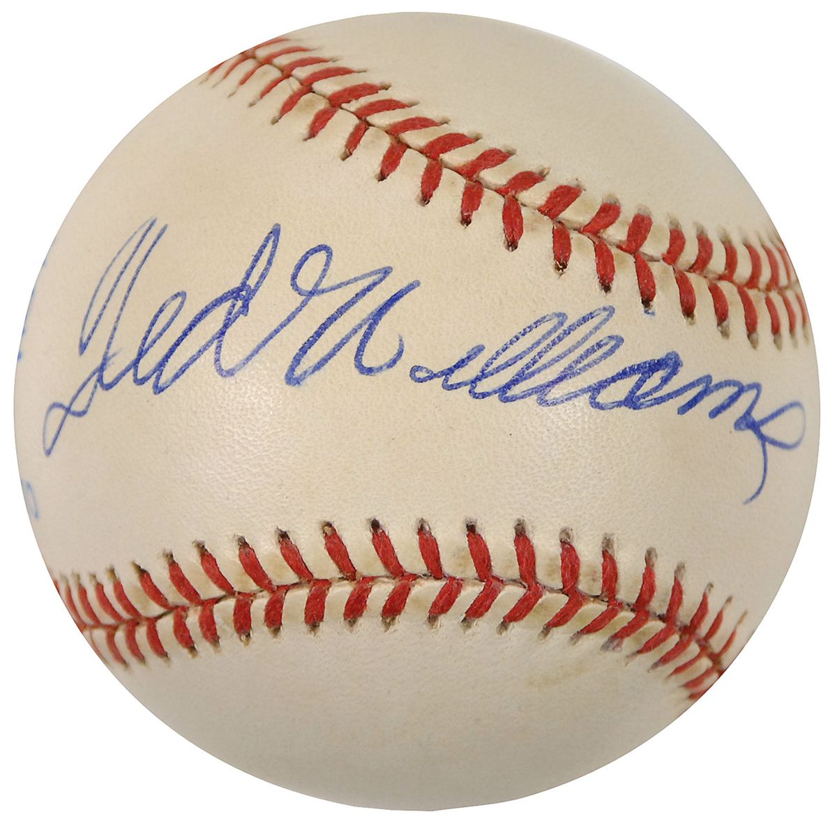 Official Rawlings American League baseball signed in blue ballpoint on a side panel. In very good condition, with a uniform shade of mild toning. Accompanied by a certificate of authenticity from Upper Deck, as well as the original box and cloth bag.