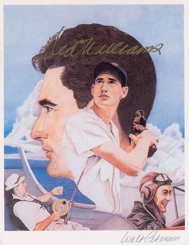 Color 4.5 x 5.75 cardstock photo of Williams as illustrated by Walt Peterson, signed at the top in gold ink by Williams and in the lower border in pencil by the artist. In fine condition. Accompanied by an invitation and ephemera from the dedication of the Ted Williams Retrospective Museum in Florida, where these were distributed.