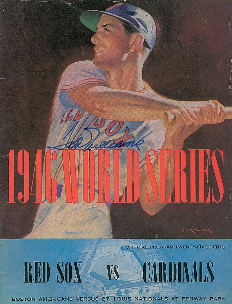 Original program for the 1946 World Series at Fenway Park, 9 x 12, 37 pages, signed later on the front cover in blue felt tip by Williams. A few creases and some chipping and slight tears to edges, otherwise fine condition. Accompanied by a full letter of authenticity from PSA/DNA.