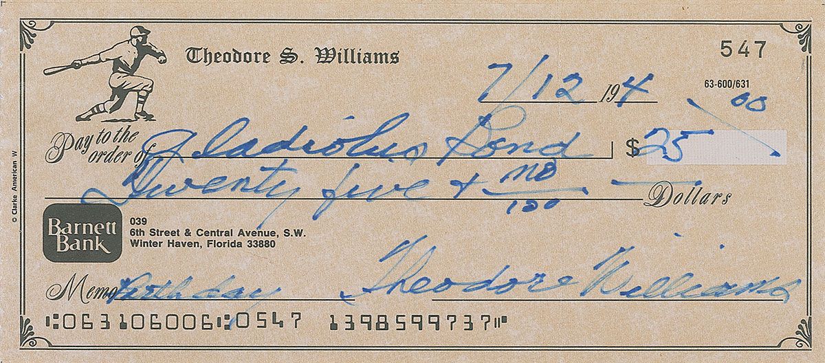 Personal check, 6 x 2.75, filled out and signed by Williams, “Theodore Williams,” payable to Gladiolus Bond for $25, July 12, 1994. In the memo field, Williams adds, “Birthday.” In fine condition, with one vertical fold passing through a single letter of the signature.