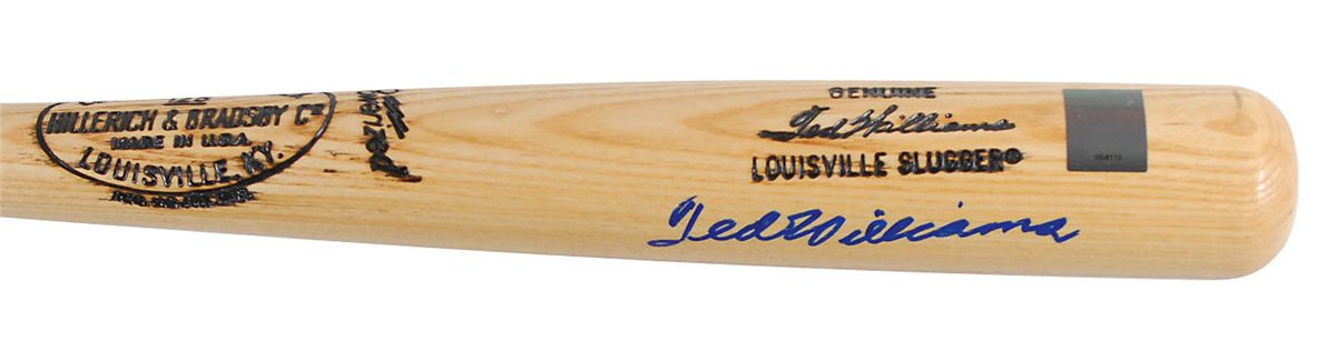 Official Louisville Slugger Ted Williams model baseball bat signed in blue felt tip on the barrel. In very fine condition, with a Williams authentication hologram affixed to end of barrel.