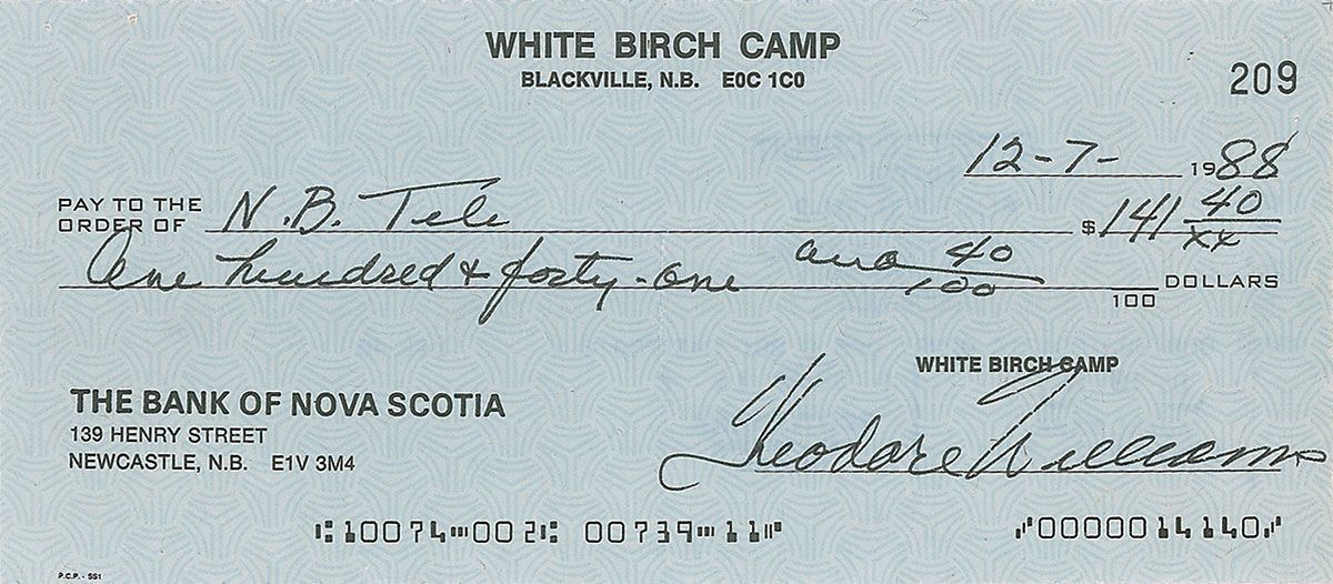 White Birch Camp business check, 7.25 x 3.25, filled out and signed by Williams, “Theodore Williams,” payable to N. B. Tele for $141.40, December 7, 1988. In fine condition, with an expected central vertical fold.