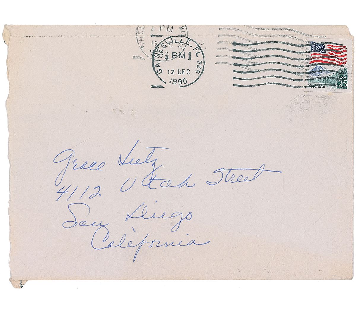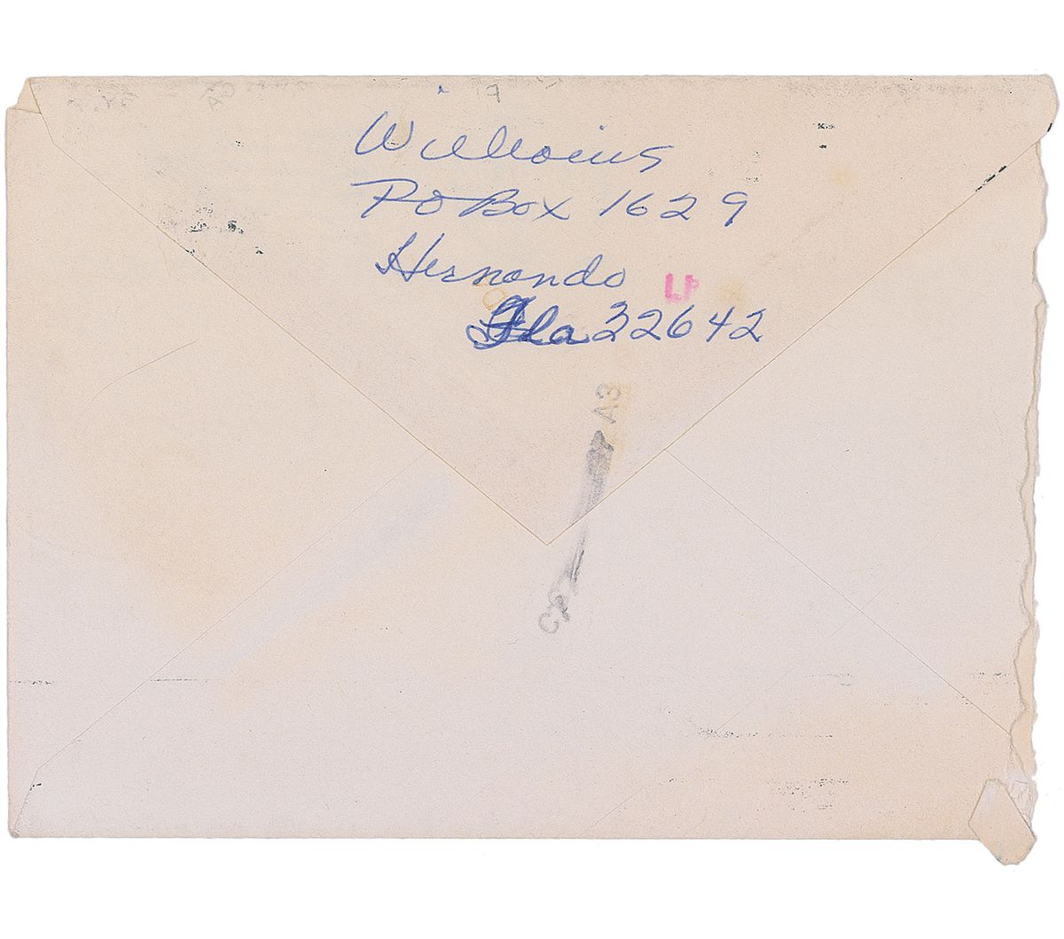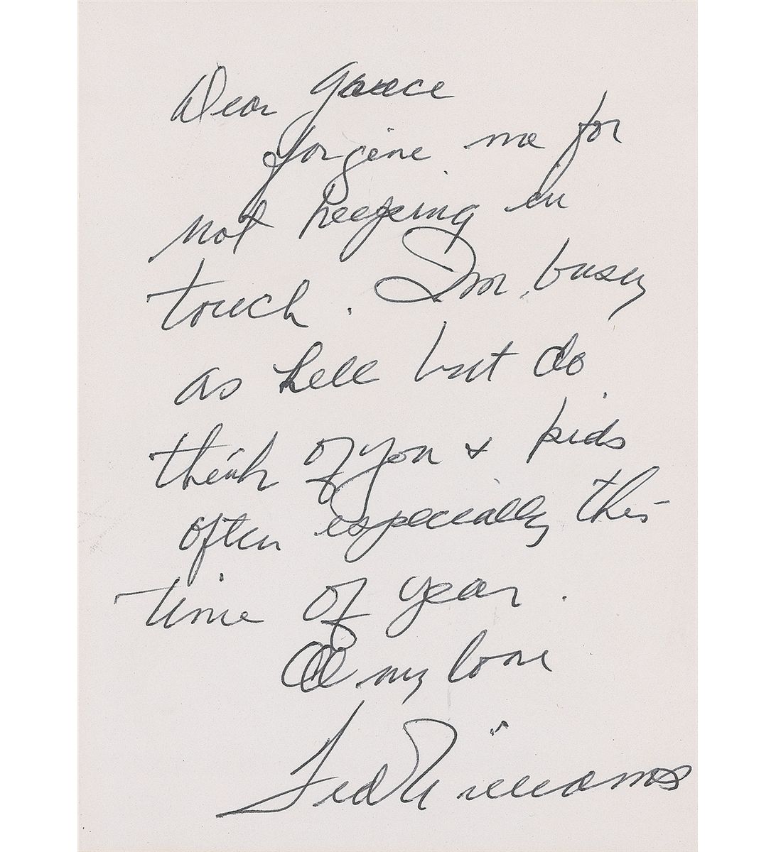 Greeting card, measuring 4.5 x 6, with a handwritten message inside to his longtime friend Grace Lutz, which reads: “Forgive me for not keeping in touch. I’m busy as hell but do think of you & kids often especially this time of year.” Signed at the conclusion, “All my love, Ted Williams.” Accompanied by the original mailing envelope. In fine condition. Lutz lived across the street from Williams when he was growing up in San Diego.