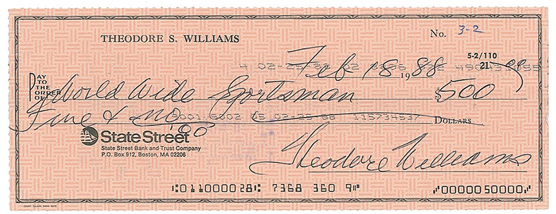 Personal check, 8.25 x 3, filled out and signed by Williams, “Theodore Williams,” payable to World Wide Sportsman for $500, February 8, 1988. In fine condition.