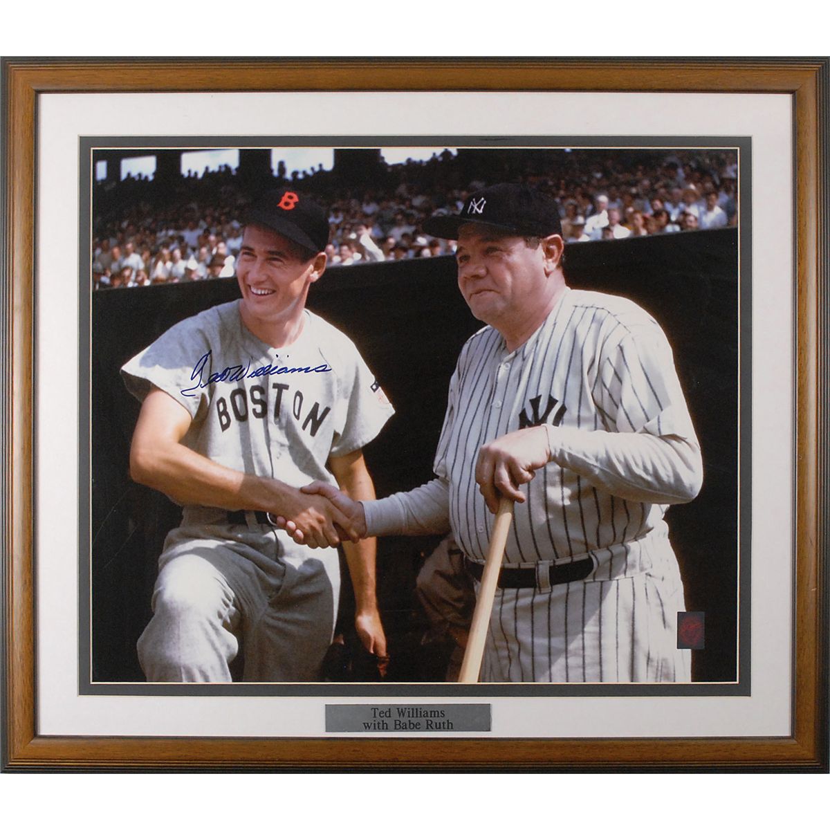 Impressive color glossy 23.5 x 19.5 photo of Ted Williams meeting Babe Ruth, signed in blue felt tip by Williams. Double-matted and framed to an overall size of 30.5 x 26.5. In fine condition, with a Green Diamond label affixed to the lower right. Accompanied by a certificate of authenticity from Green Diamond. Oversized.