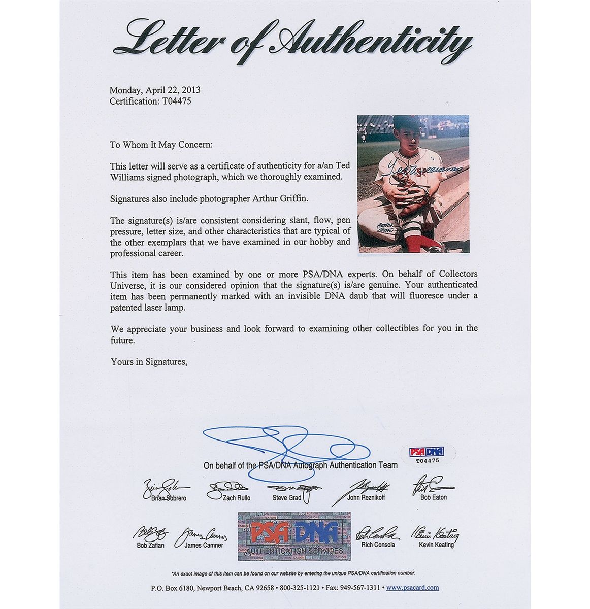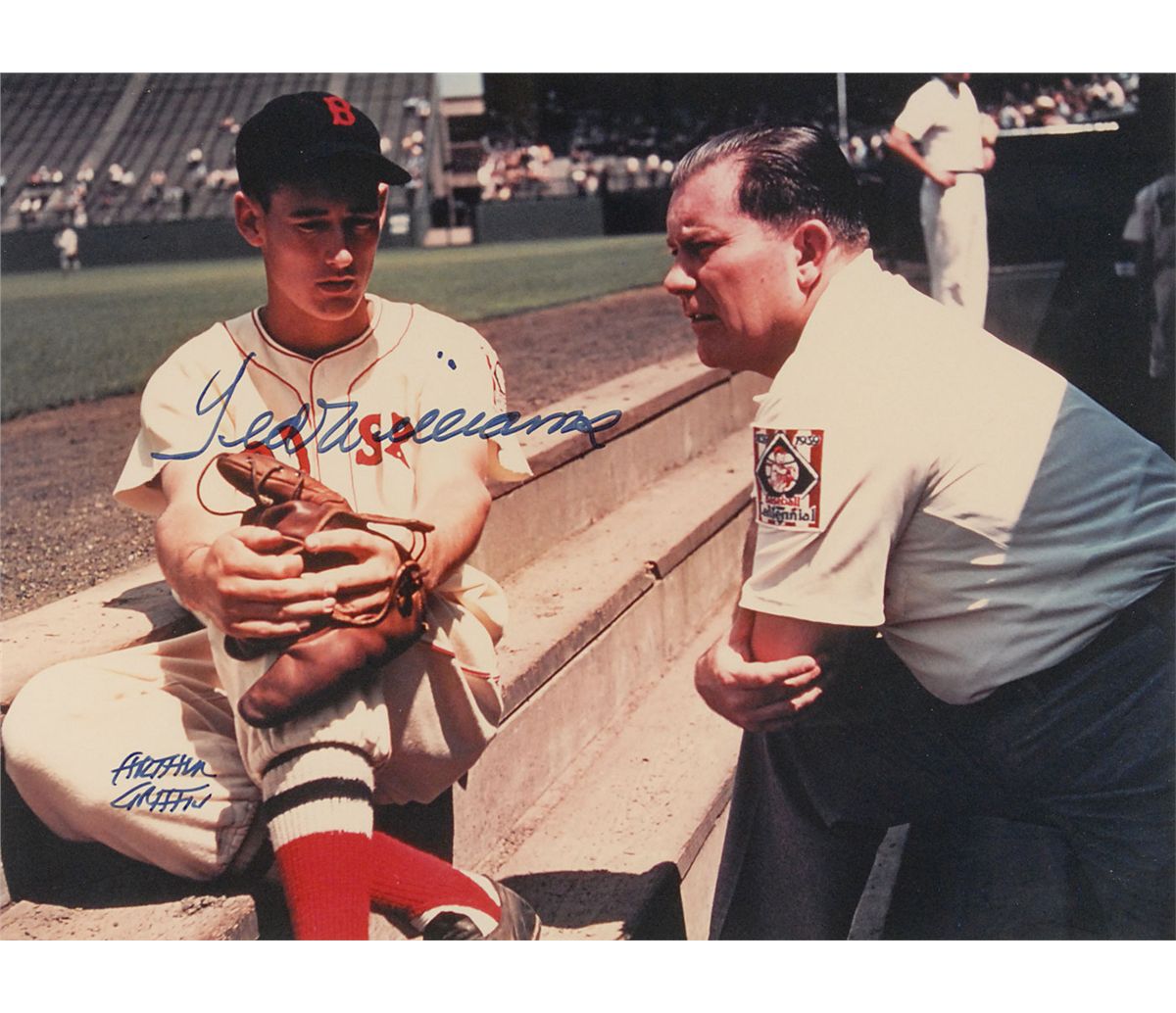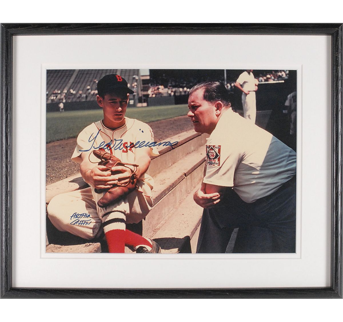 Wonderful color satin-finish 13.5 x 10 photo of Williams very early in his career, signed across his jersey in black felt tip. Also signed in the lower left by the photographer, Arthur Griffin. Handsomely double-matted and framed to an overall size of 18.5 x 15. In fine condition. Accompanied by a full letter of authenticity from PSA/DNA.