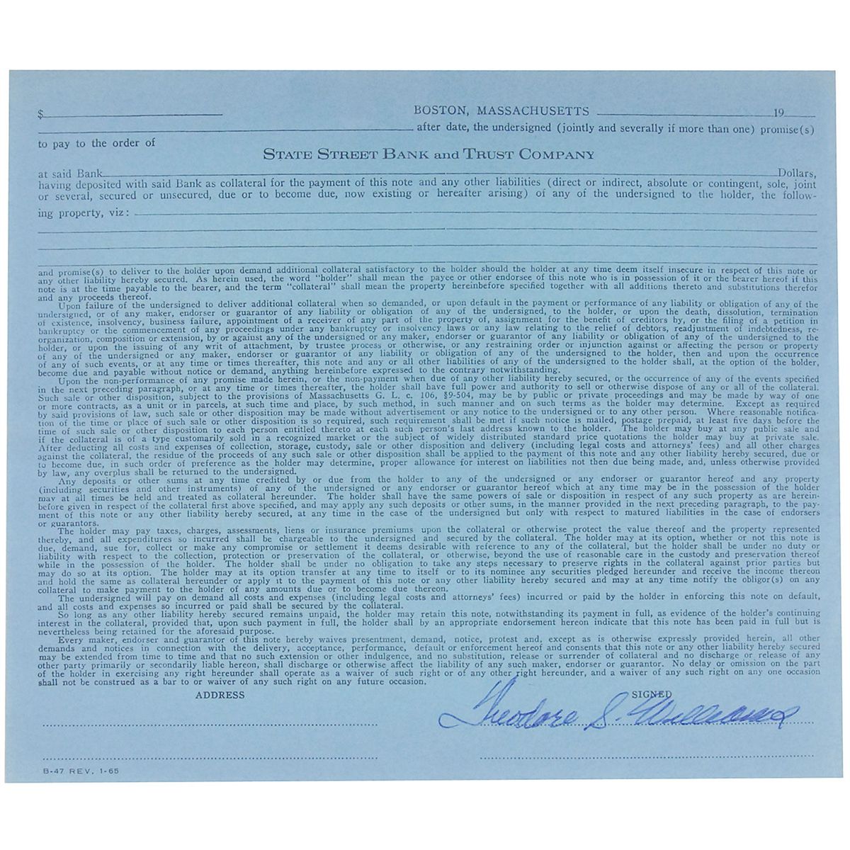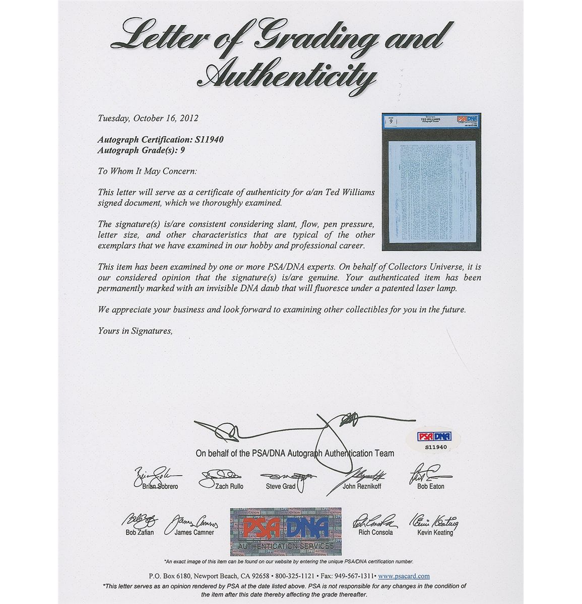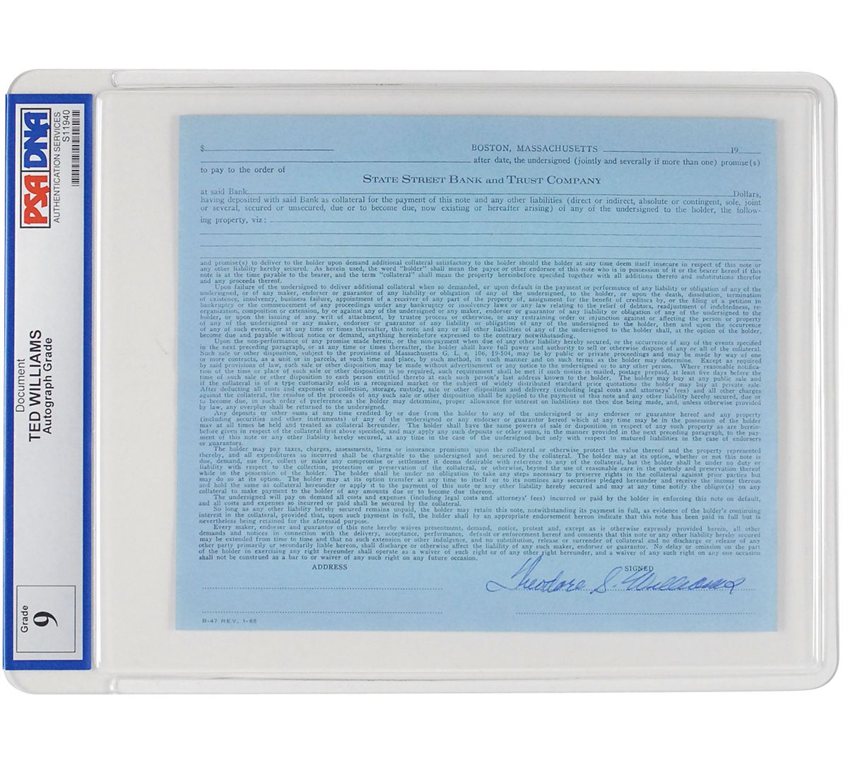DS, signed “Theodore S. Williams,” one page, 8.5 x 7.75, no date. Blank State Street Bank and Trust company financial document. Encapsulated in a plastic PSA/DNA authentication and grading holder, evaluating the autograph at a grade of “9.” In fine condition. Accompanied by a full letter of authenticity from PSA/DNA.