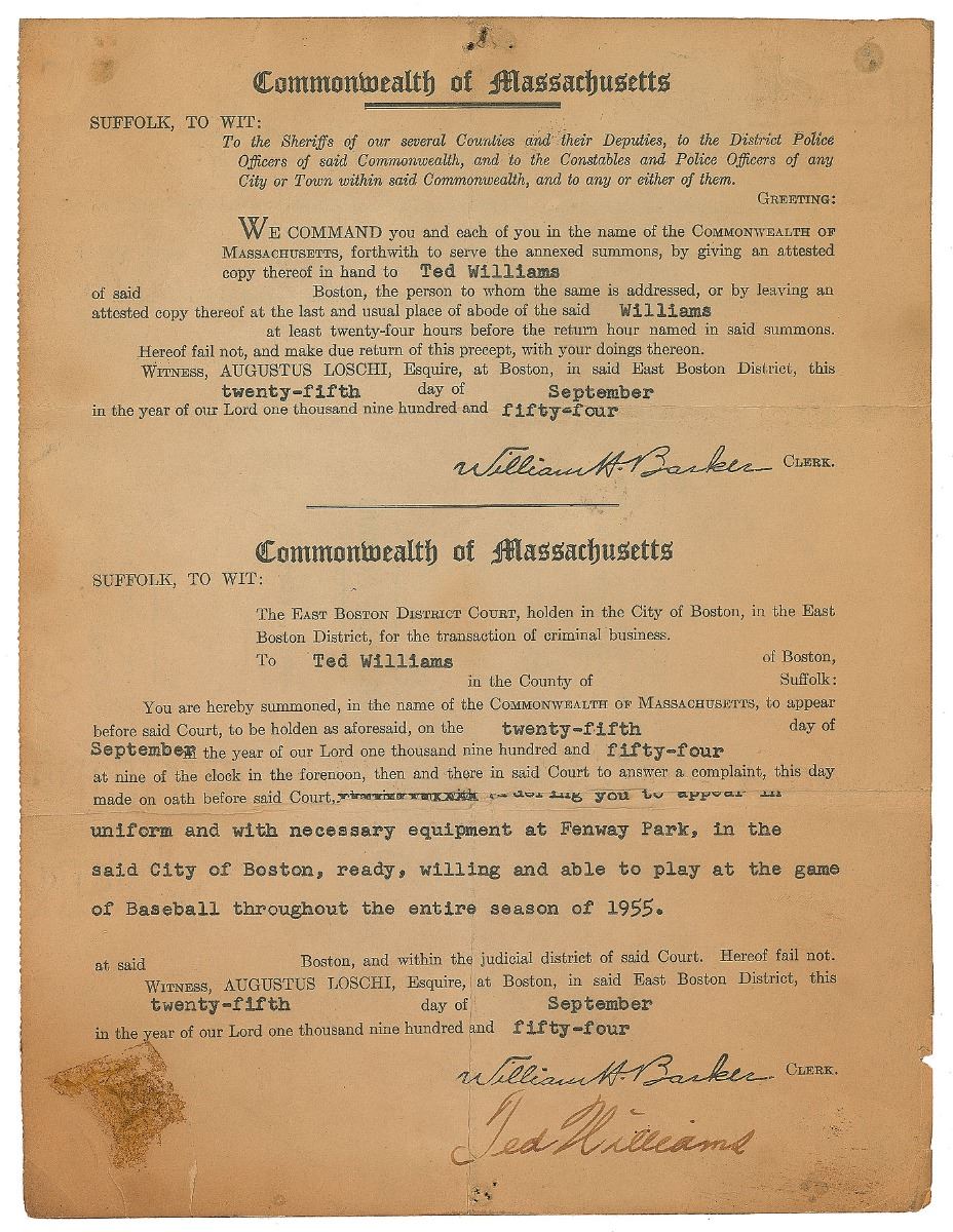 DS, one page, 7.5 x 10.25, September 25, 1954. Commonwealth of Massachusetts summons ordering Williams “to appear in uniform and with necessary equipment at Fenway Park, in the said City of Boston, ready, willing and able to play at the game of Baseball throughout the entire season of 1955.” Signed at the conclusion by Williams. Mounted to a sheet of heavy cardstock and in very good condition, with scattered toning and creasing, tack holes to top edge, and adhesive residue to the lower left corner. Williams sat out the first month of the 1955 season due to a divorce settlement with his wife, Doris, but was ultimately named the ‘Comeback Player of the Year,’ batting .356, hitting 28 home runs, and driving in 83 runs.