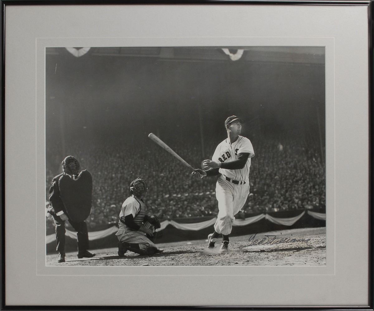 Handsome matte-finish 18 x 14 photo of Williams batting on opening day in 1947, signed in black felt tip. Attractively double-matted and framed. In fine condition. Oversized.
