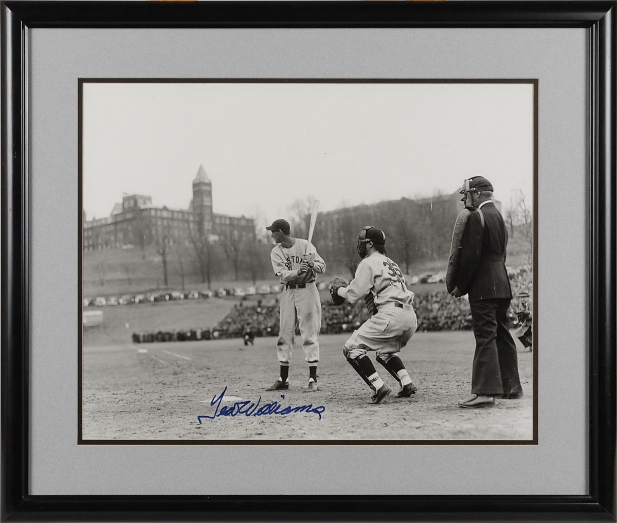 Fantastic oversized semi-glossy 18.5 x 14.5 photo of Williams at bat, signed in black felt tip. Double-matted and framed to an overall size of 26 x 22. In fine condition. Please contact RR Auction for a shipping quote.