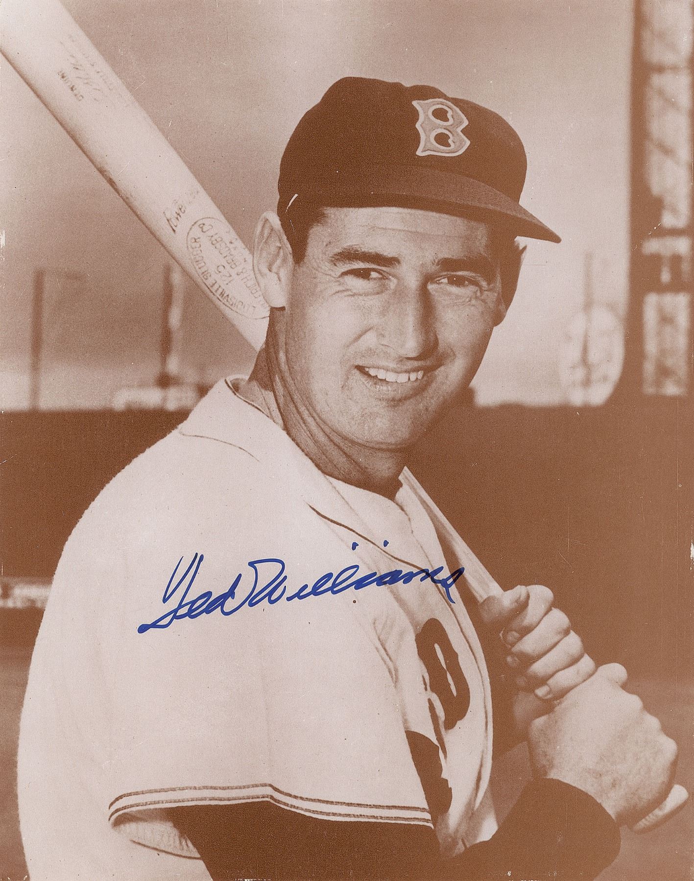 Semi-glossy sepia-tone 11 x 14 cardstock photo of Ted Williams wearing his Boston Red Sox uniform with a bat propped on his left shoulder, signed in blue felt tip. In fine condition.