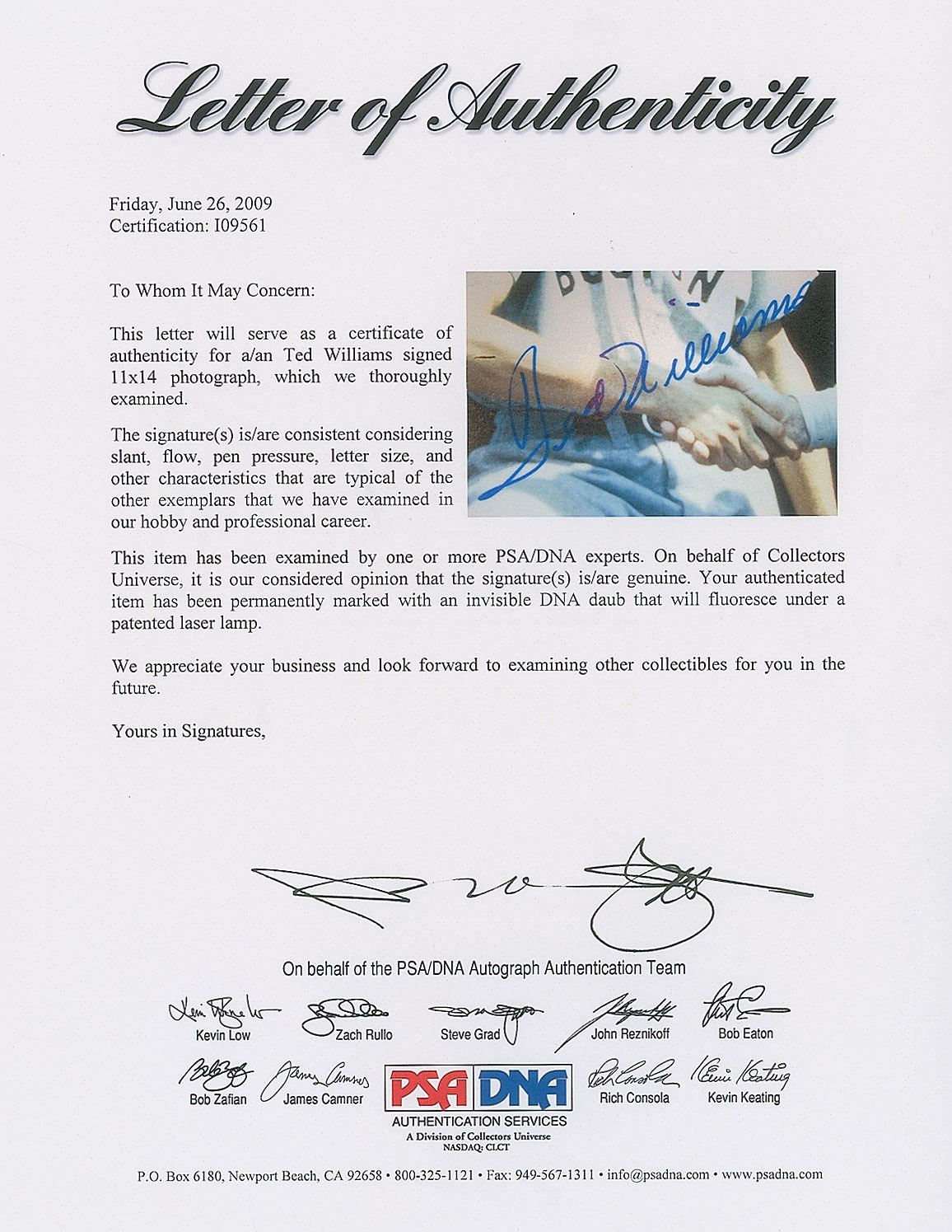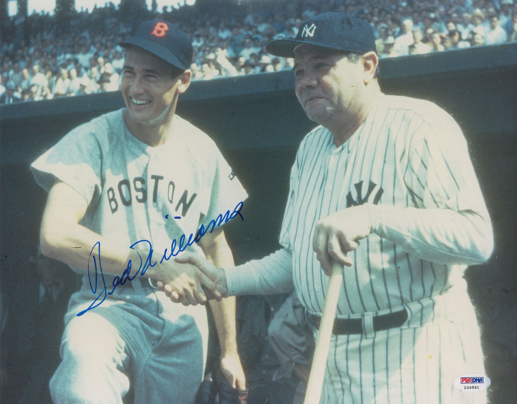 Color satin-finish 14 x 11 photo of Ted Williams shaking hands with Babe Ruth, signed in blue felt tip by Williams. In very fine condition, with a PSA/DNA label affixed to the lower right corner. Accompanied by a full letter of authenticity from PSA/DNA.