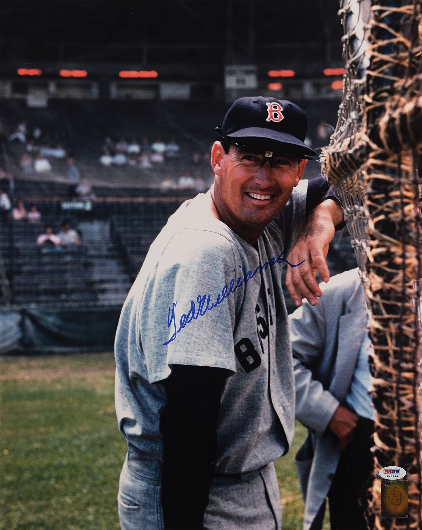 Super clear color glossy 16 x 20 half-length photo of Ted Williams smiling in his Boston Red Sox uniform, signed in blue felt tip. In very fine condition, with a PSA/DNA label affixed to lower right corner (certificate not present).