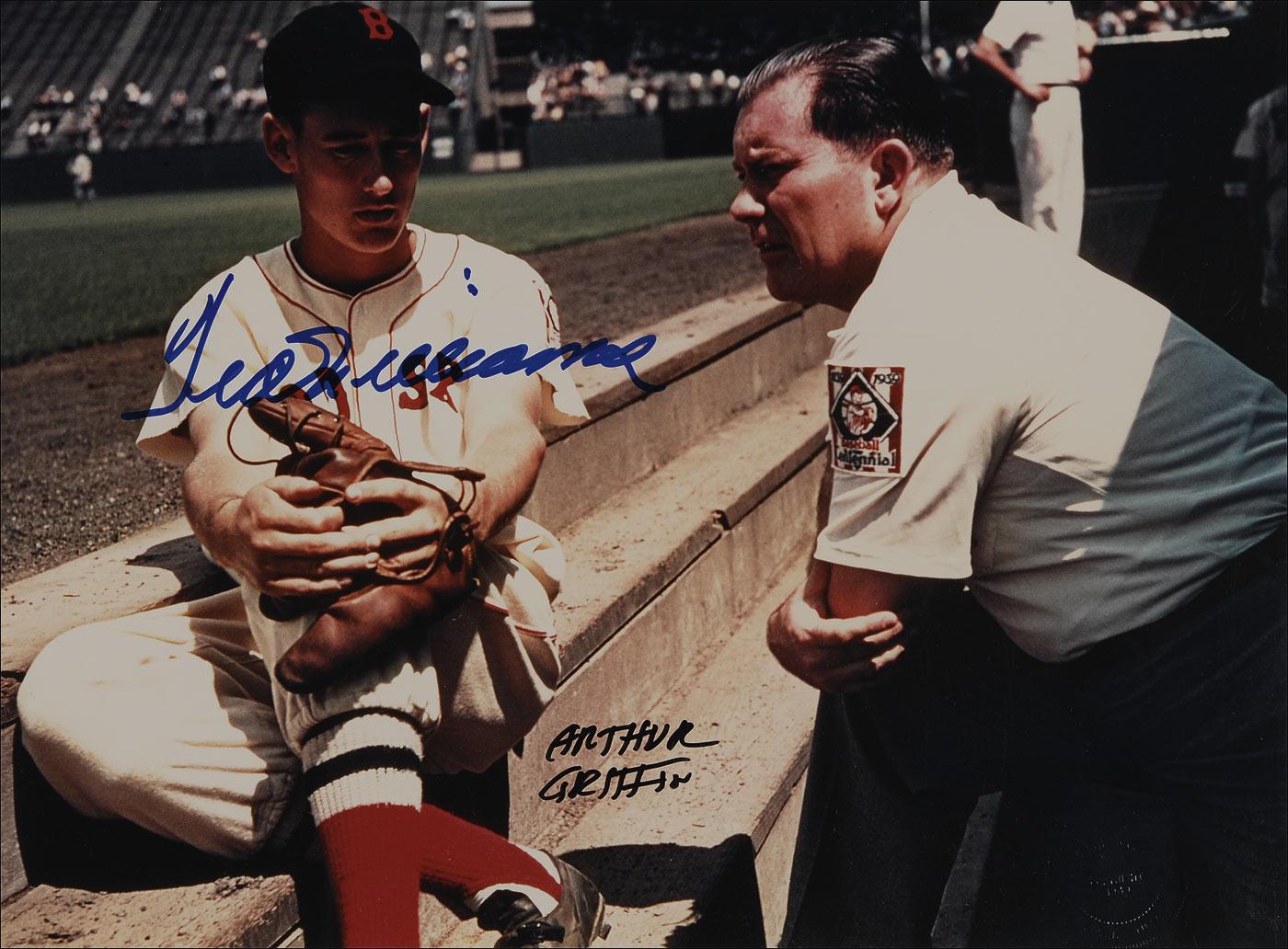 Fantastic color satin-finish 13.5 x 10 photo of a young Ted Williams in his 1939 rookie year sitting on the Fenway dugout steps chatting with owner Tom Yawkey, signed in blue felt tip by Williams, and also signed in black felt tip by the photographer Arthur Griffin. Double matted to an overall size of 18.5 x 15. In very fine condition, with photographer’s embossed seal to lower right. Pre-certified Steve Grad/PSA/DNA and RRAuction COA.