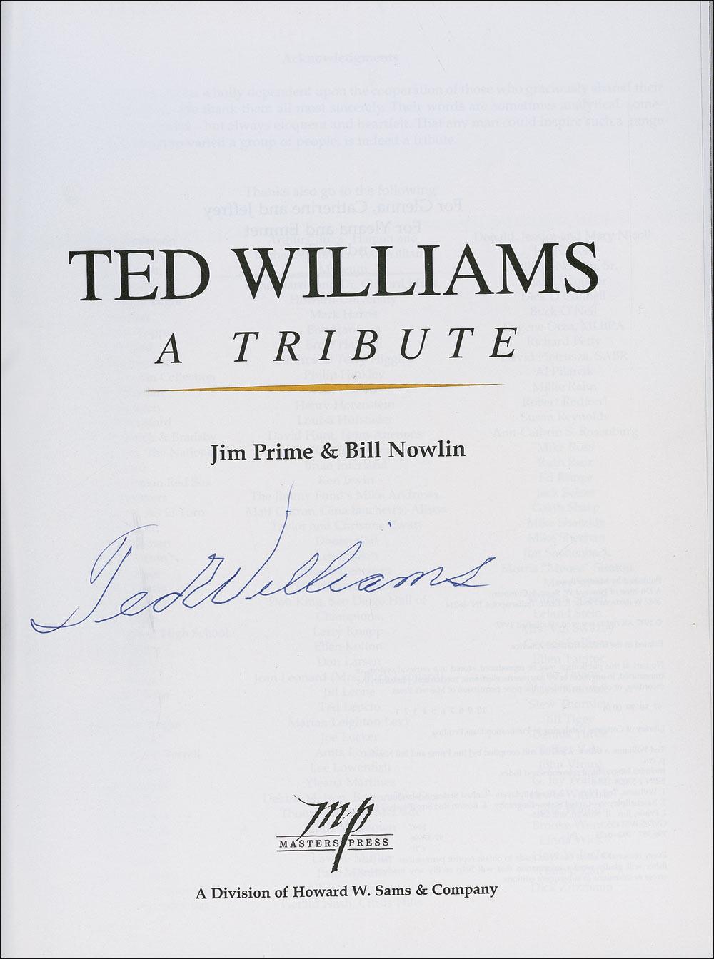 Signed book: Ted Williams: A Tribute. First edition, first printing. Indianapolis, Indiana: Masters Press, 1997. Hardcover with dustjacket, 9 x 11.25, 246 pages. Signed on the title page in blue ballpoint. In fine condition, with some scattered light creases and a couple trivial edge tears to dustjacket. Accompanied by a certificate of authenticity from Green Diamond Sports. Pre-certified Steve Grad/PSA/DNA and RRAuction COA.