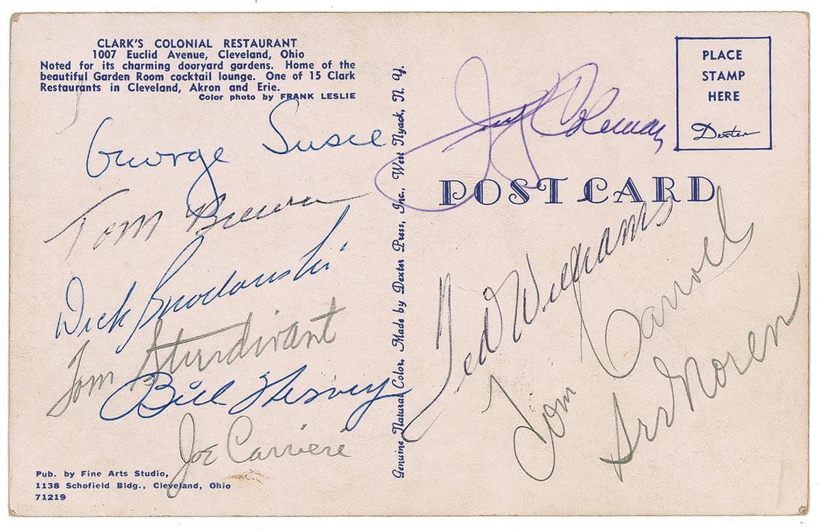 Color 5.5 x 3.5 postcard photo of Clark’s Colonial Restaurant in Cleveland, Ohio, signed on the reverse in black ballpoint by Williams, and also signed in ballpoint and pencil by nine others, including Jerry Coleman, George Susie, Tom Sturdivant, and Ted Carroll. In fine condition, with some staining to top of image side, and a few light corner tip creases. Pre-certified Steve Grad/PSA/DNA and RRAuction COA.