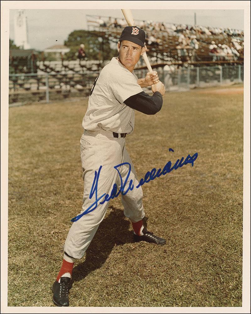 Color satin-finish 8 x 10 photo of Williams in a batting pose, boldly signed in blue felt tip. In fine condition. Pre-certified Steve Grad/PSA/DNA and RRAuction COA.