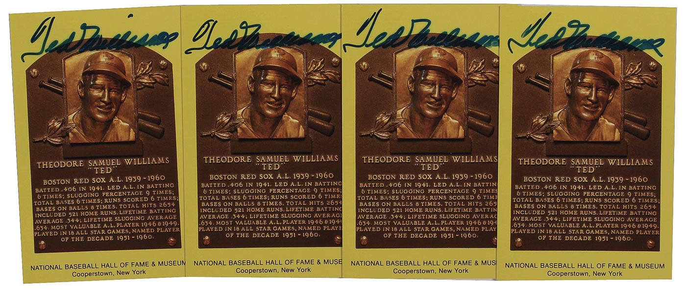 Four gold Hall of Fame plaque cards, each signed at the top in blue felt tip. In overall fine condition, with a spreading of ink resulting in a slightly fuzzy appearance. RRAuction COA.