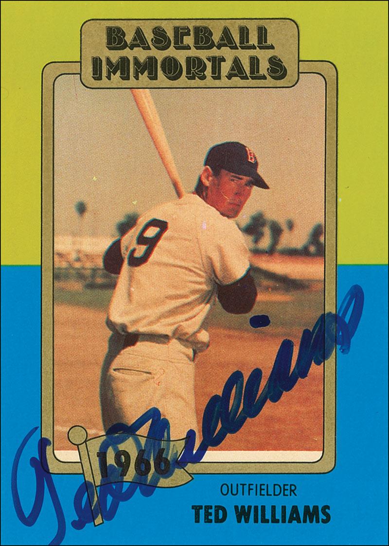 Color Baseball Immortals trading card, showing Williams with a bat on his shoulder, signed across the front in blue felt tip. In fine condition. Pre-certified Steve Grad/PSA/DNA and RRAuction COA.