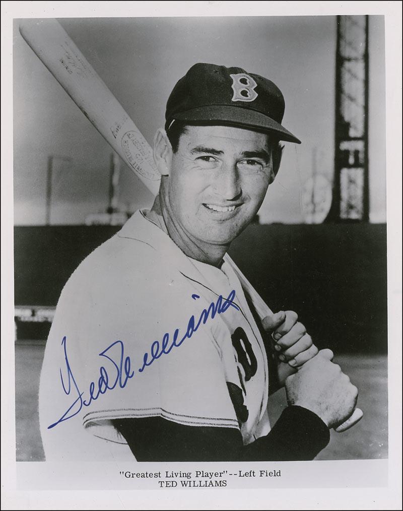 Excellent glossy 8 x 10 photo of Williams with his bat on his shoulder and Fenway’s Green Monster in the background, with the caption proclaiming Williams as the “Greatest Living Player,” signed in blue felt tip. In fine condition, with a few scattered light surface marks. Pre-certified Steve Grad/PSA/DNA and RRAuction COA.