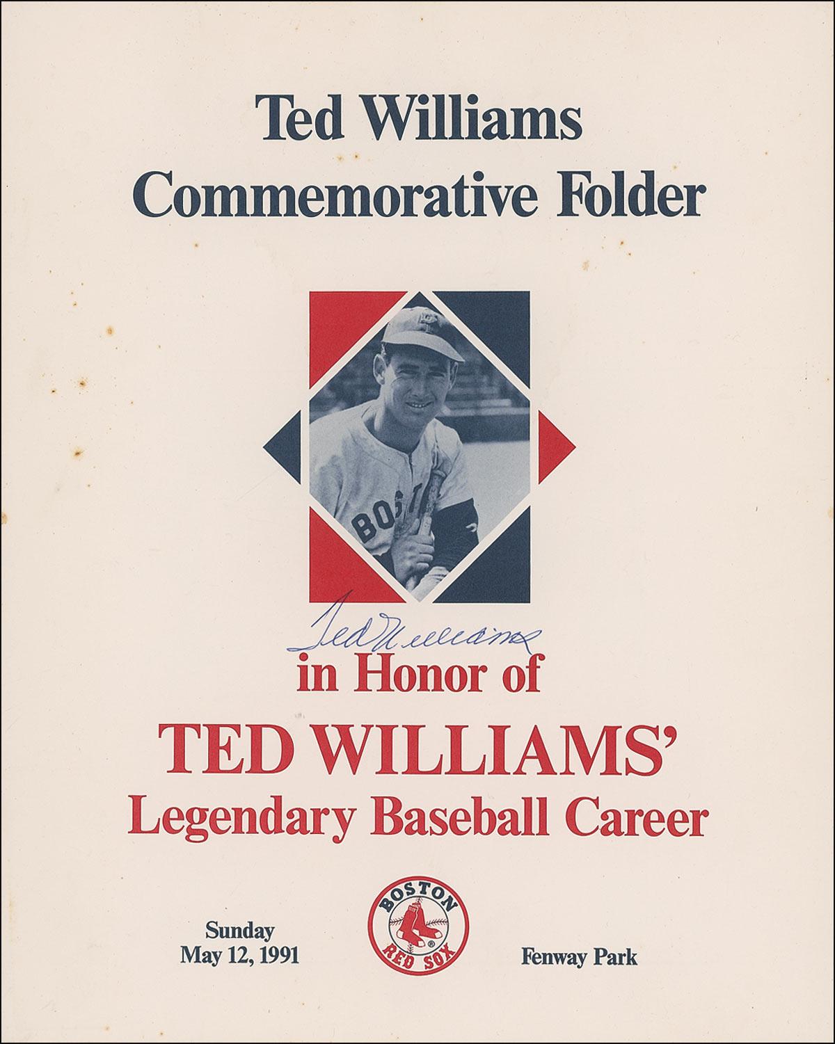 Color commemorative folder, 12 x 15, in honor of Williams’s legendary baseball career, issued on May 12, 1991 as part of Ted Williams Day, signed on the front cover in blue ballpoint. Some scattered light foxing to covers, as well as some light rippling along top edge, otherwise fine condition. Accompanied by a ticket stub from the game.