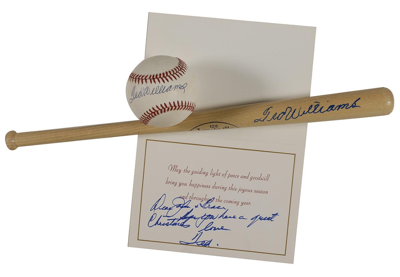 Three items: official Rawlings American League baseball, signed on the sweet spot in blue ballpoint; a Louisville Slugger mini baseball bat, signed on the barrel in blue felt tip; and a brief ANS, signed “Ted,” on the inside of a pre-printed Christmas card, bearing an image of the US Capitol on the front. Inside Williams writes under the pre-printed sentiment, “Dear John & Traci, Hope you have a great Christmas. Love, Ted.” In fine condition, with some scattered mild toning to ball.