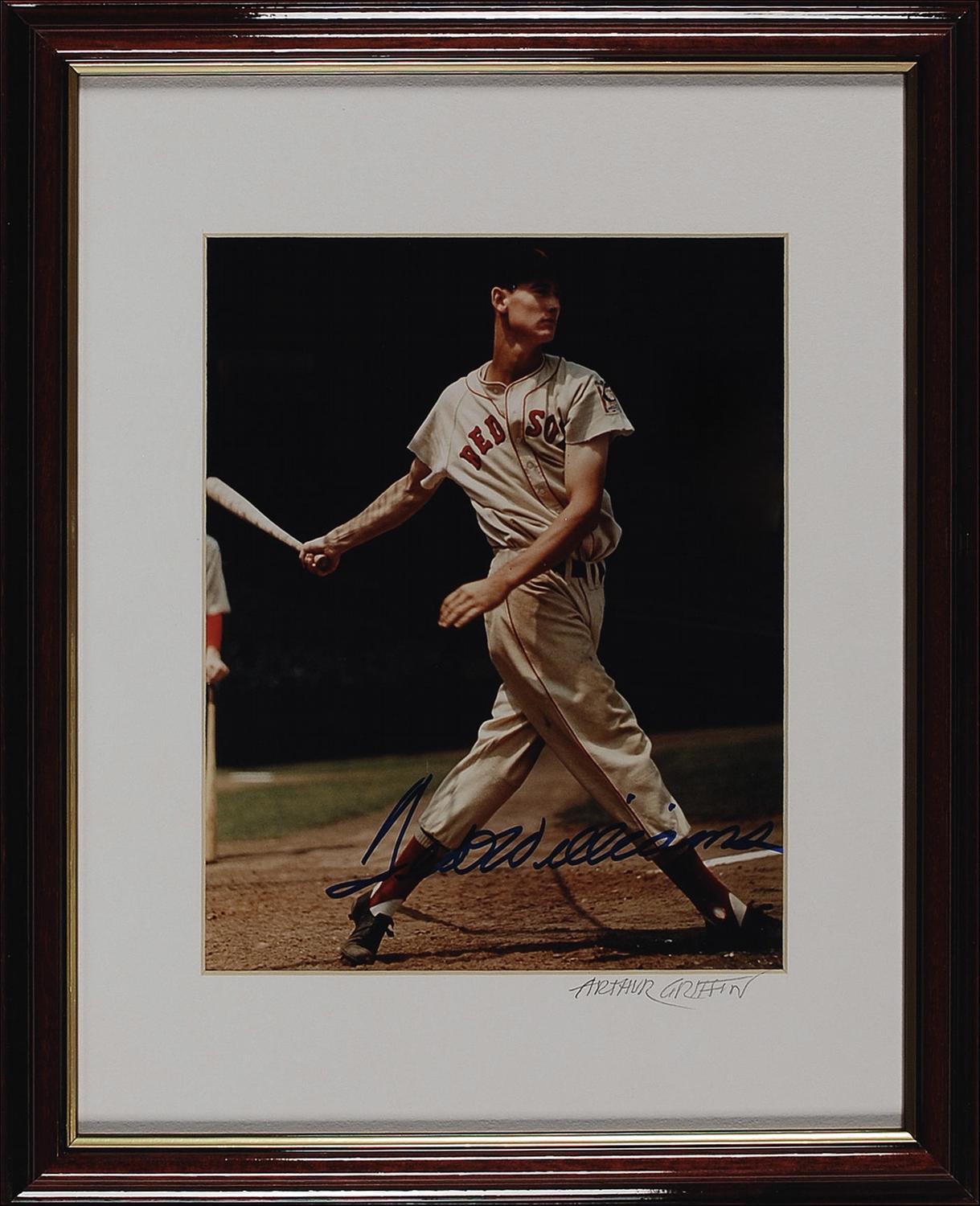Color 8 x 10 Arthur Griffin photo of a young Williams taking a swing at Fenway Park in 1939, signed in blue felt tip. Matted and framed, with Griffin having signed the mat in pencil, to an overall size of 12.75 x 15.75. In very fine condition, with photographer’s embossed seal to lower right. A crystal clear Griffin image from the season that marked the beginning of Boston’s love affair with Teddy Ballgame. In 2002, when Williams died, Sports Illustrated used this same image for its cover. Accompanied by the original 1998 Collector’s Showcase of America show ticket where signature was acquired.