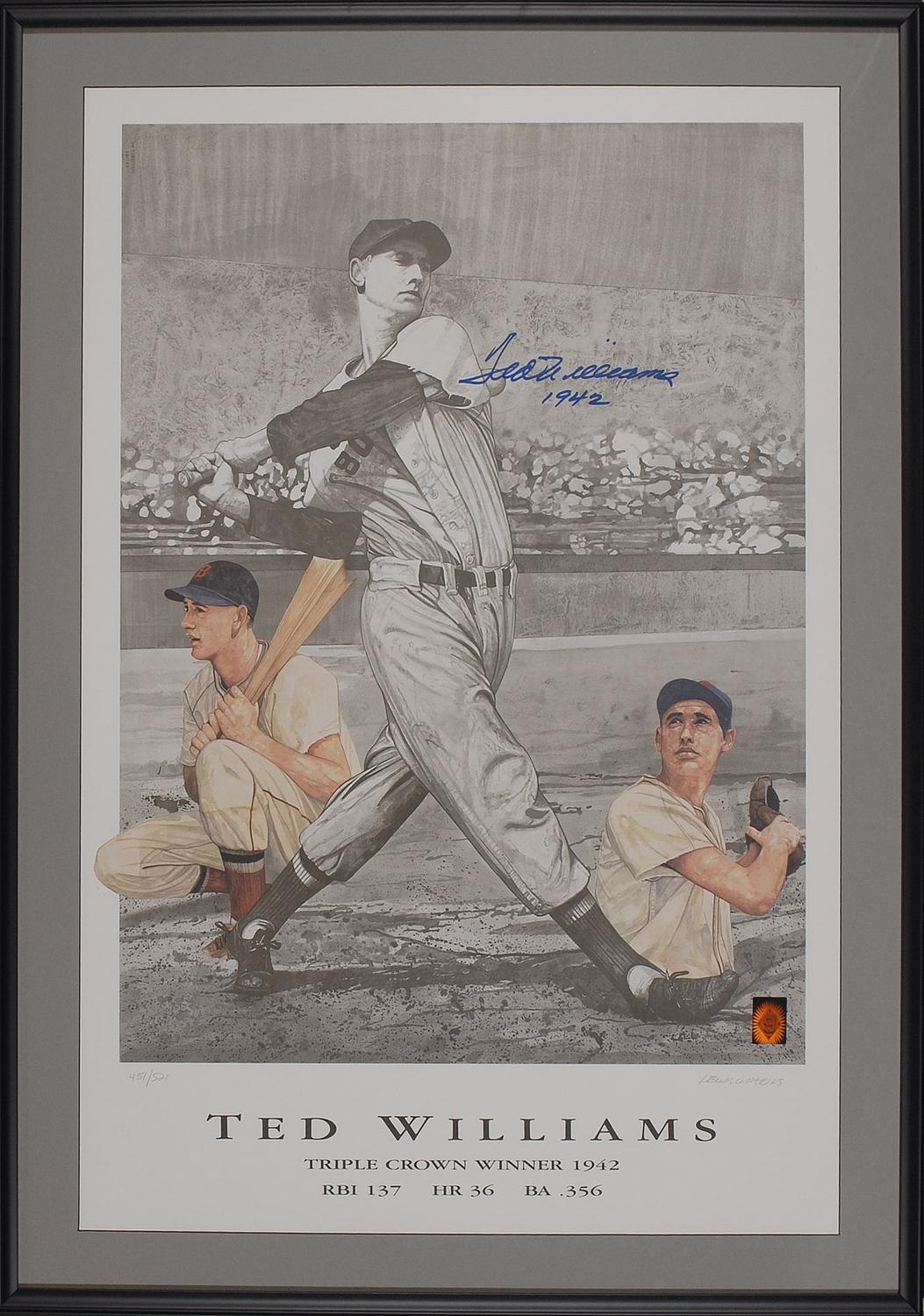 Superb limited edition 25 x 35 lithograph honoring Williams’s Triple Crown season, numbered #451/521, signed in blue felt tip, “Ted Williams 1942.” Also signed in pencil by the artist, Lewis Watkins. Matted and framed to an overall size of 27.5 x 39. In very fine condition, with a Green Diamond hologram affixed to lower right corner. Oversized.