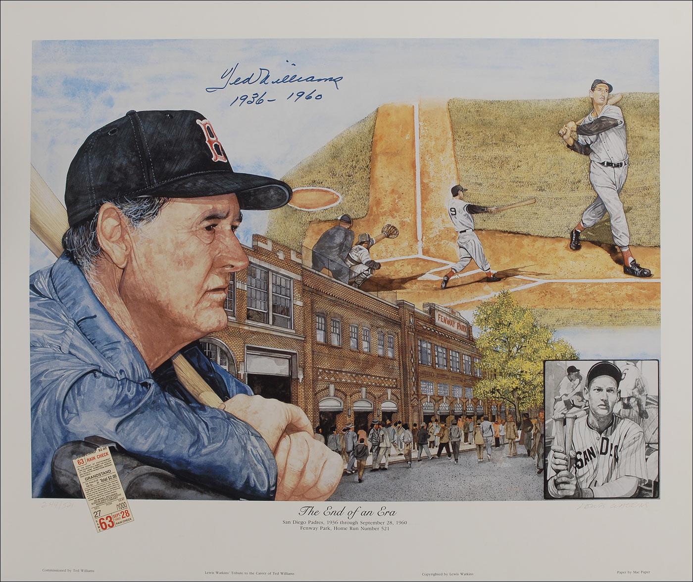 Color limited edition 26.5 x 22.5 print entitled “The End of an Era, commemorating Williams’ illustrious career with the Boston Red Sox,” numbered #244/521, signed in blue felt tip, “Ted Williams, 1936–1960.” Also signed in pencil by the artist, Lewis Watkins. In fine condition.