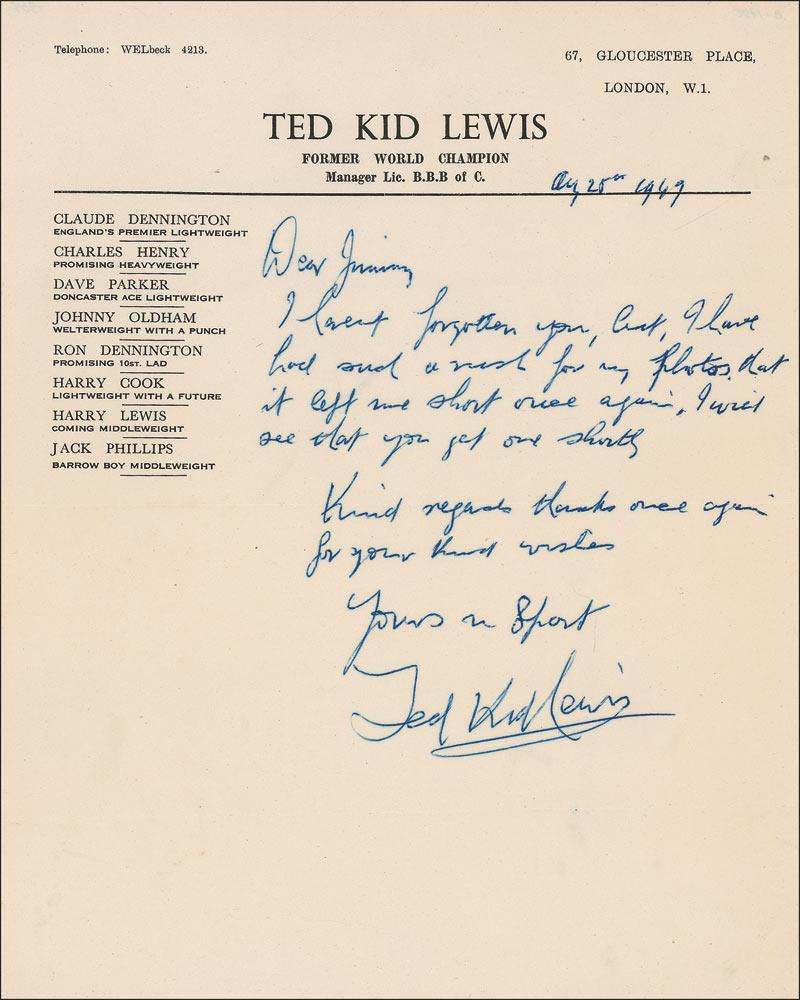 English boxer who won the world welterweight championship in 1915. ALS, one page, 8 x 10, personal letterhead, August 25, 1969. Letter to an admirer regarding a photo. In full: “I haven’t forgotten you, but, I have had such a rush for my photos, that it left me short once again. I will see that you get one shortly.” In fine condition, with a few light creases, and a slightly fuzzy appearance to text. Pre-certified Steve Grad/PSA/DNA and RRAuction COA.