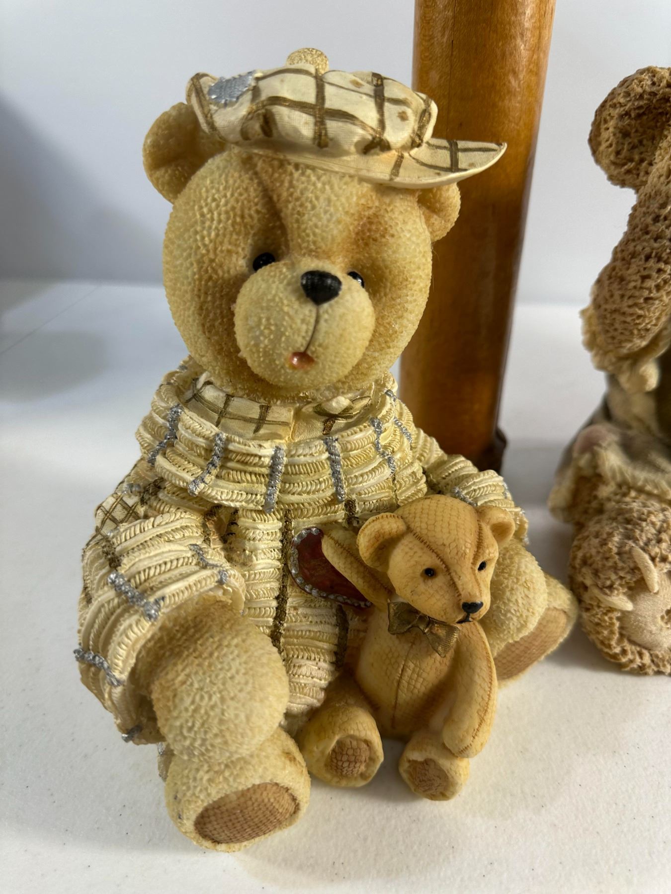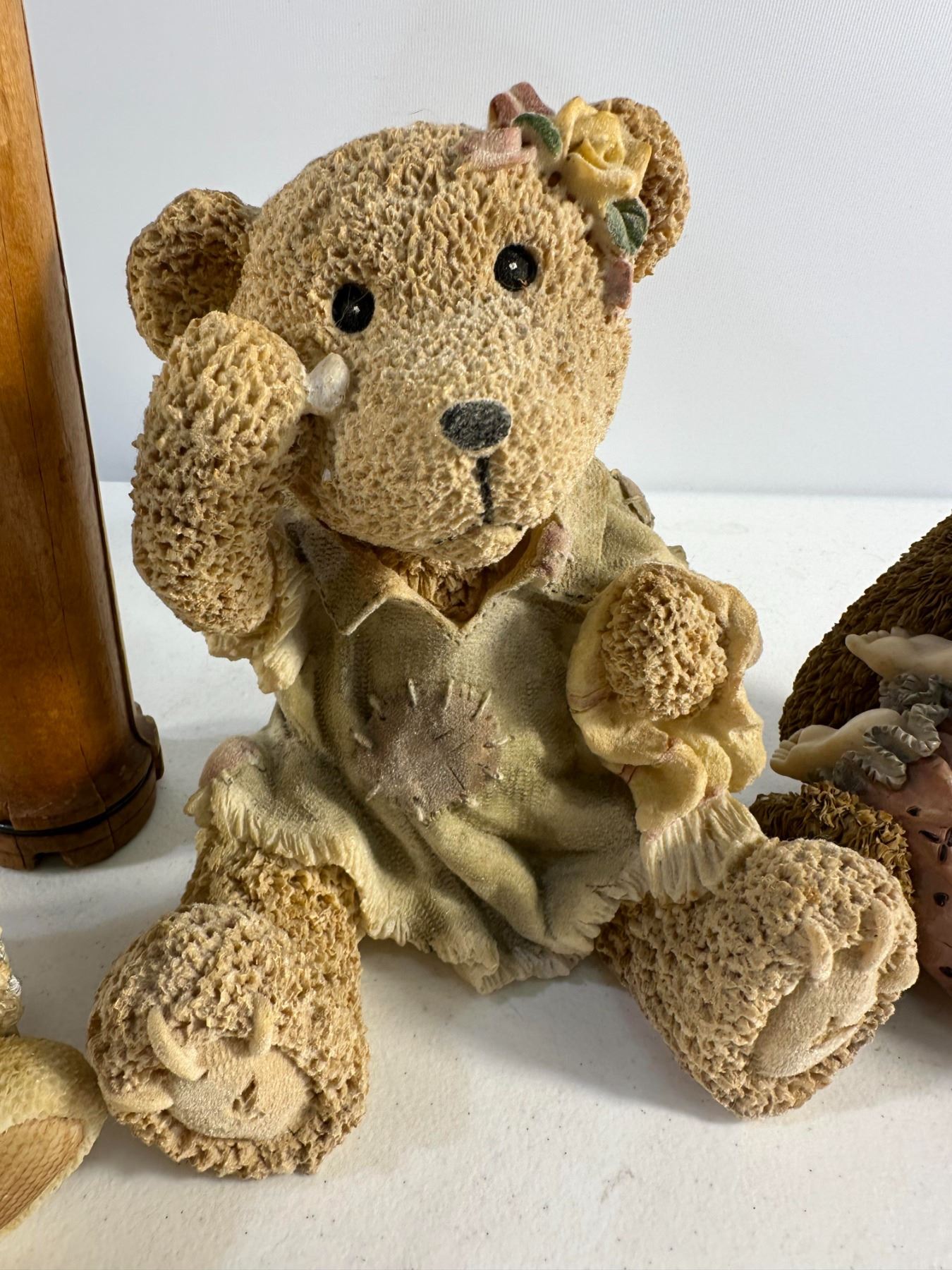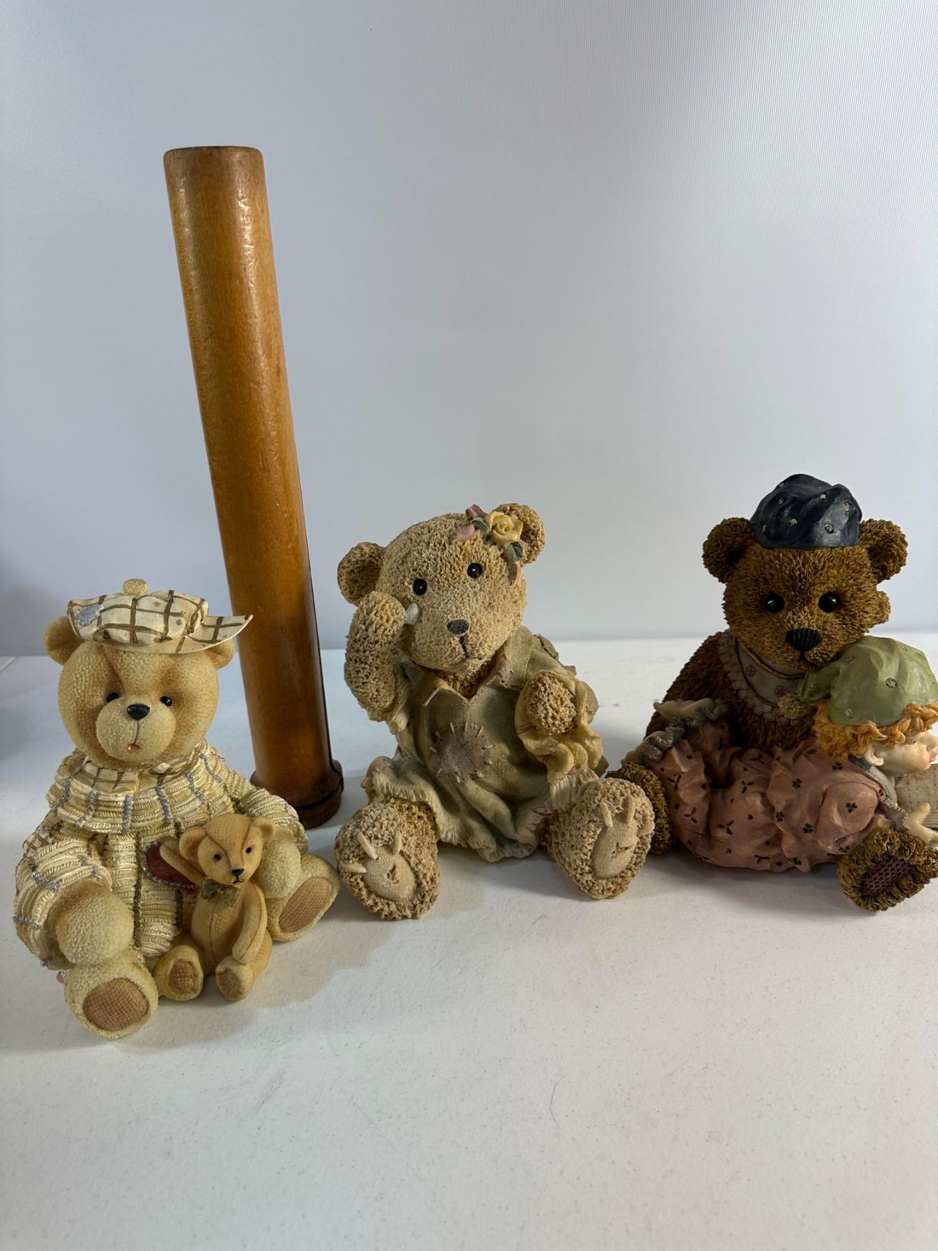 Group of vintage-style resin teddy bear figurines in various outfits, plus a classic wooden rolling pin. Good condition with light age wear.