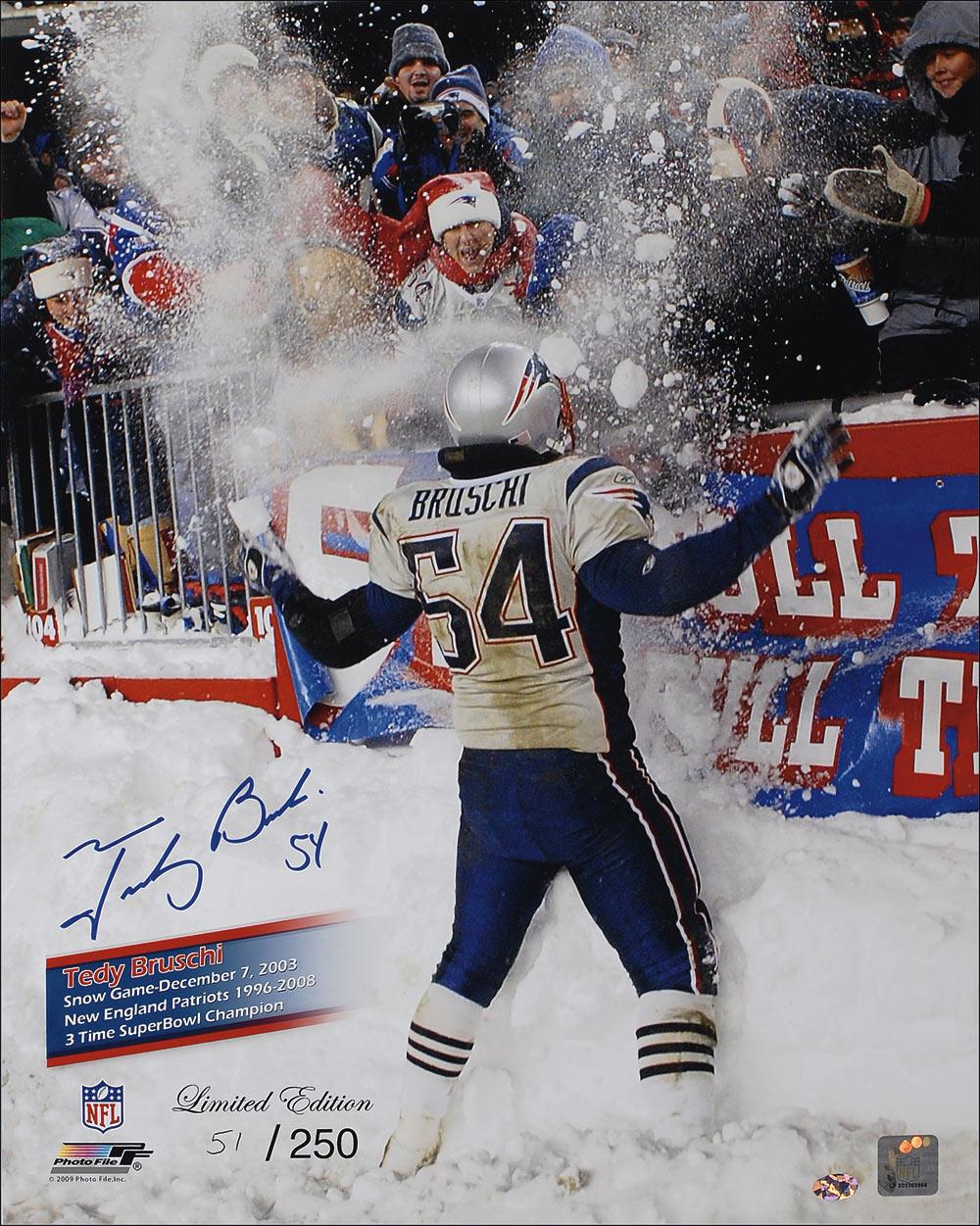 Limited edition color glossy 16 x 20 photo of Bruschi celebrating with a snow shower with Patriot fans on December 7, 2003, #51/250, signed in blue felt tip. In very fine condition.