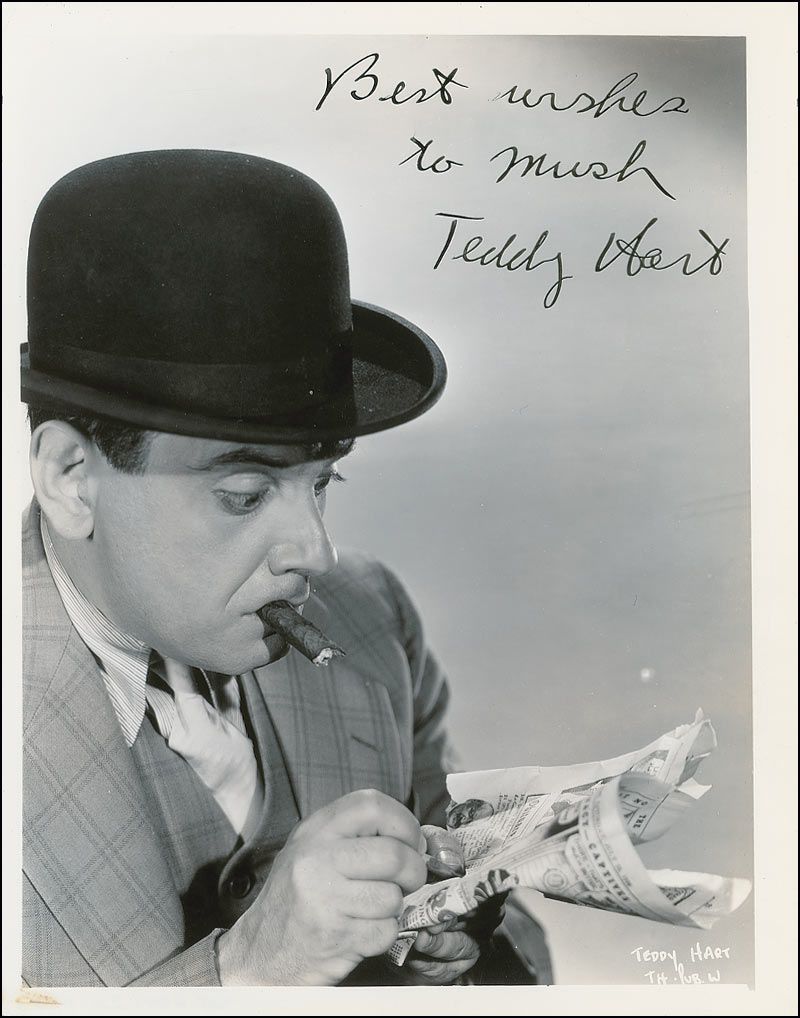 American screen comedian (1897-1971) best known as the Indian ‘Crowbar’ in the popular Ma and Pa Kettle film series. Vintage glossy 8 x 10 photo, signed and inscribed in fountain pen “Best wishes to Mush, Teddy Hart.” Small marginal stain, mild rippling to emulsion, and a few scattered small surface marks, otherwise fine condition.