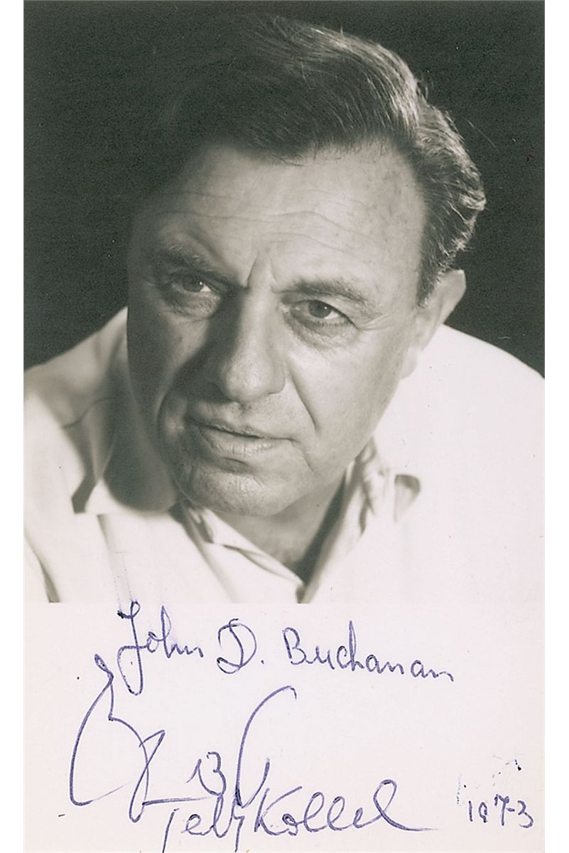 Matte-finish 2.25 x 3.75 photo of Kollek by Alfred Bernheim, signed and inscribed in blue ballpoint, “John D. Buchanan, Teddy Kollek, 1973,” and also signed in Hebrew. In fine condition.