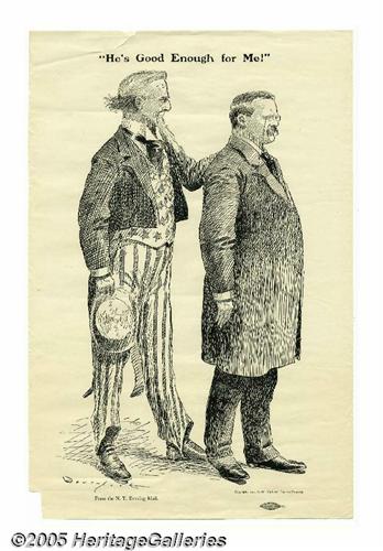 <B>Teddy Roosevelt 1904 Campaign Cartoon Poster by Homer Davenport</B></I> Homer Davenport was one of the most important political cartoonists of his day, working mostly for William Randolph Hearst. In 1904, he was at the rival <I>New York Evening Mail</B></I> though and that's where this political cartoon was first published. It pictures a dignified and serious Uncle Sam figure patting Teddy Roosevelt on the back and saying <I>"He's Good Enough For Me!"</B></I> This is an original union-printed poster of this image used by Roosevelt in his successful 1904 campaign for re-election. Fine condition save for one small corner tear affecting nothing, 11" x 16.5" in size. There is a rare but familiar 3.5" button with this same design, but this is the first time we've encountered it in poster format. Lot:261
