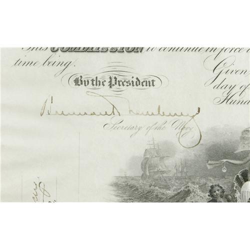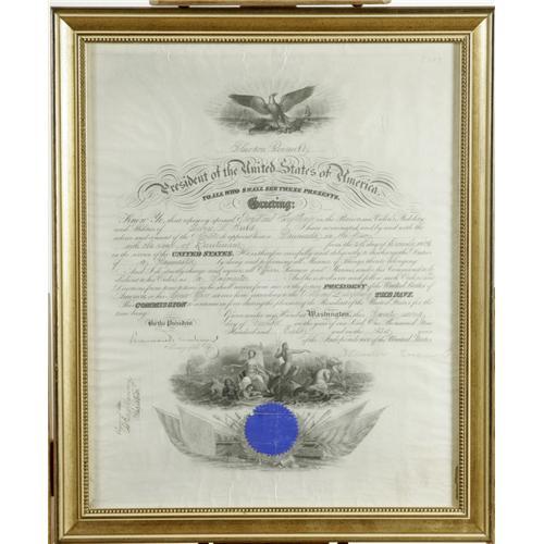 <B> Teddy Roosevelt Document Signed,</B></I> "<I> Theodore Roosevelt</B></I>". One page, 15.5" x 19.0", Washington, D.C., December 22, 1908. This partially printed document is a U.S. Navy commission naming one George P. Auld a "<I> Paymaster in the Navy with the rank of Lieutenant</B></I>". Roosevelt's mildly faded signature is accompanied by that of the Navy Secretary, Truman H. Newberry. A rollicking maritime vignette graces the lower margin of the piece. Featured are Neptune and Liberty amidst mythical sea creatures. Small area of loss to lower right border that is hardly visible in the frame. Very Good condition. In gilt wooden frame, 18.0" x 22.0" overall.