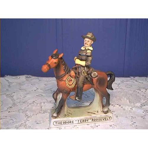Whiskey Flask of horse and rider. This flask is marked "Theodore "Teddy" Roosevelt" and "Another Grenadier © Orig. April 1977". Also has his date of birth and date of death on it. This whiskey flask measures 6.25 inches high and 5.75 inches wide and is in very good condition.