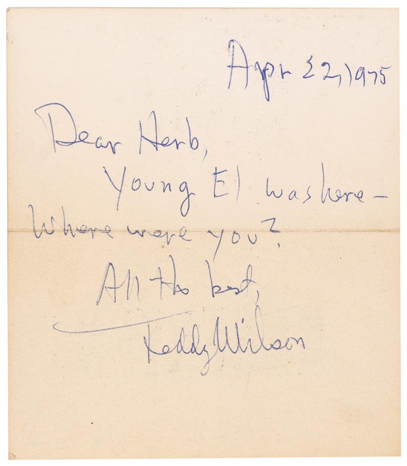 American jazz pianist (1912-1986) who, by joining the Benny Goodman Trio in 1935, became the first black musician to perform with a previously all-white jazz group. In the 1930s Wilson recorded dozens of hit records with various singers, including many of Billie Holiday’s most successful records. ANS, on the inside of a 4.25 x 5 table reservation card, April 22, 1975. Short note to Herb. In full: “Young El was here–Where were you?” In very good condition, with uniform toning to lower half of letter over signature, a couple corner tip dings, and a central horizontal fold.