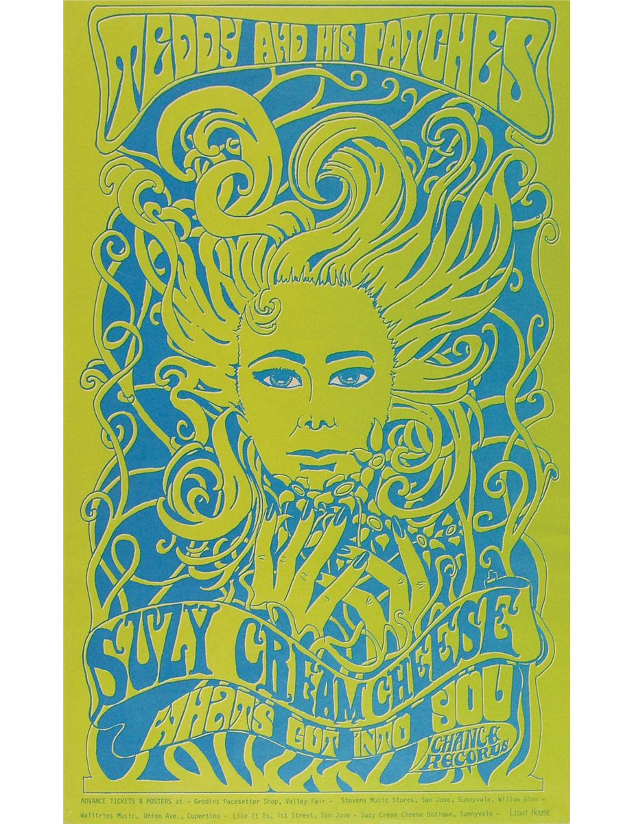 Psychedelic original 14 x 22 poster advertising the Teddy and His Patches single ‘Suzy Creamcheese’ by Chance Records. In fine condition, with tack holes to corners. The track takes its title from the pseudonym of Suzy Zeiger, a peripheral member of Frank Zappa and the Mothers of Invention, and features a remake of the intro to the Zappa song ‘The Return of the Son of Monster Magnet.’