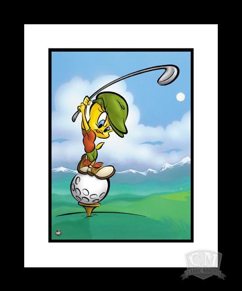 This framed limited edition 16x20 giclee is entitled “Tee Off Tweety ." Tweety is basically a passive character, who stands by and watches as Sylvester formulates elaborate and inevitably unsuccessful schemes to capture him. Edition Size 500.“Giclé