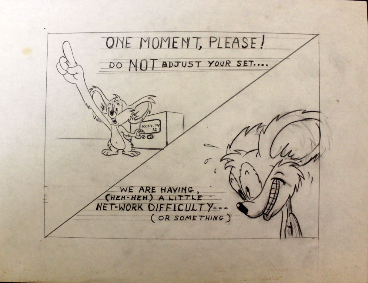 This drawing was done for a TV station at Schlessinger Studios. Drawing is by Les Stonehart, no signature. Measures 8 1/2" x 11".