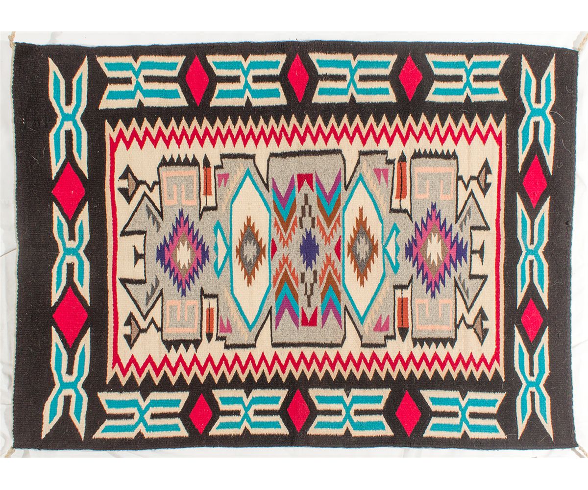 This small wool rug, 31 x 43,” was used as a display piece at the Ahwanhee Hotel Gift Shop in Yosemite National Park. The weaver is Delores Tsosie. The rug was originally from Tobe Turren’s Indian Trading Co. in Gallup, NM. Its wide black border encompasses bright turquoise and red designs, and the central blocked design also carries through with turquoise, red, pink, blue, and brown designs on a natural ground. The Teec Nos Pos name, meaning “Cottonwoods in a Circle,” comes from a settlement in the northeast corner of the Navajo Nation. These weavings are characterized by a wide border and center sections filled with an exuberant variety of motifs [www.rugtrader.com/styles/teecnosp2.htm]. Purchased in 2000. This is a sturdy weaving in excellent condition. Fairbanks Collection - HKA#65394